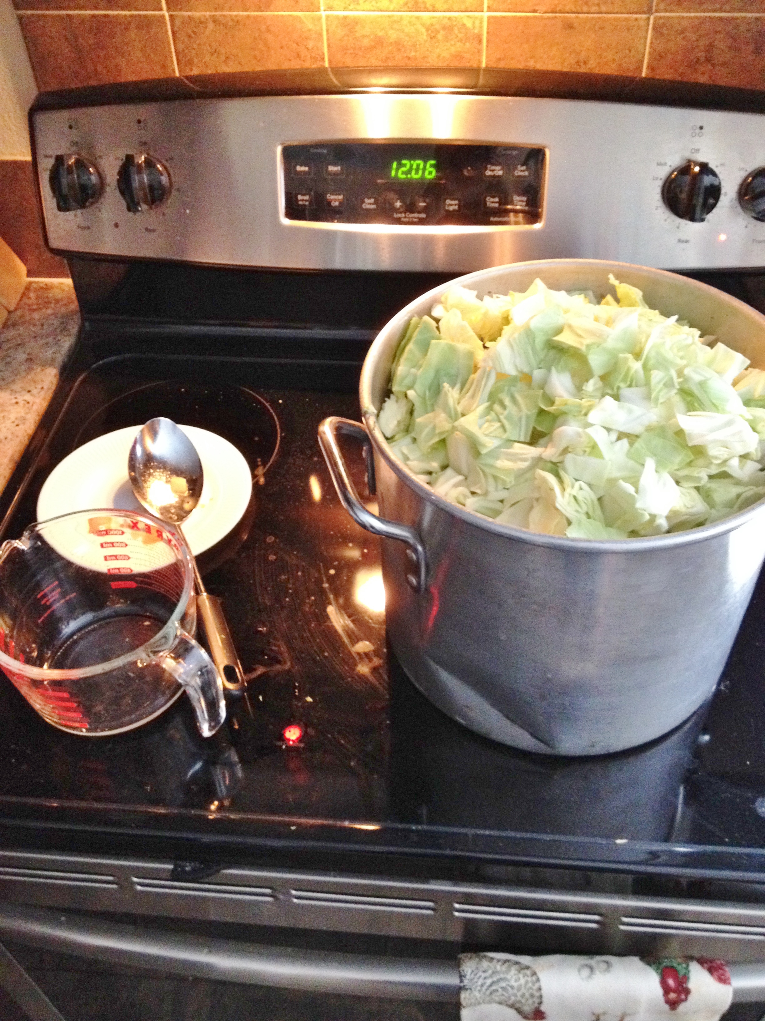 2. Cut all veggies into small pieces and dump into pot. As the veggies overtake the liquid in the pot add water.