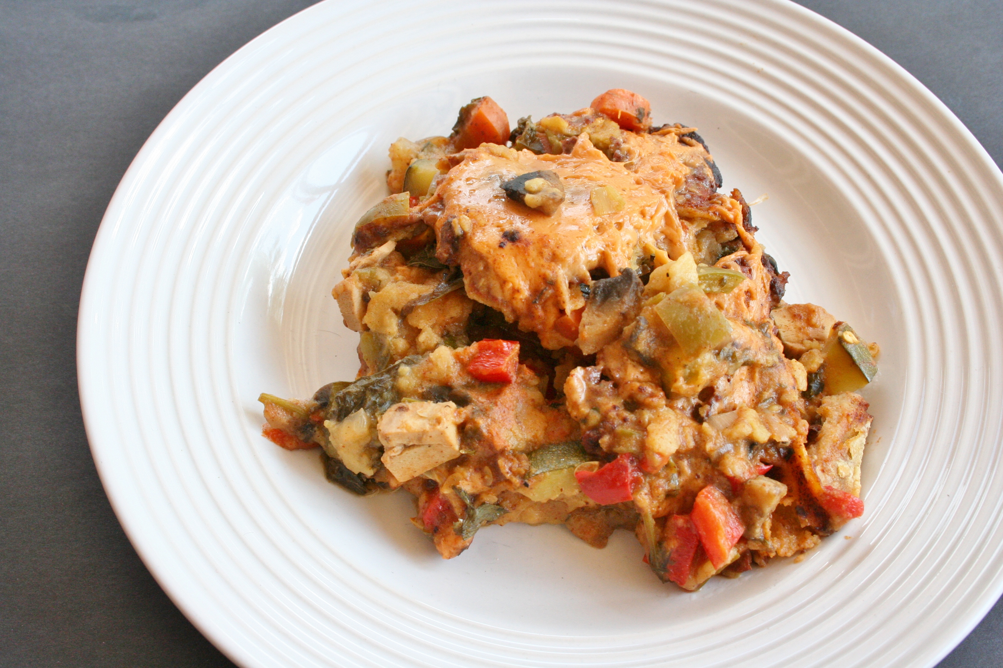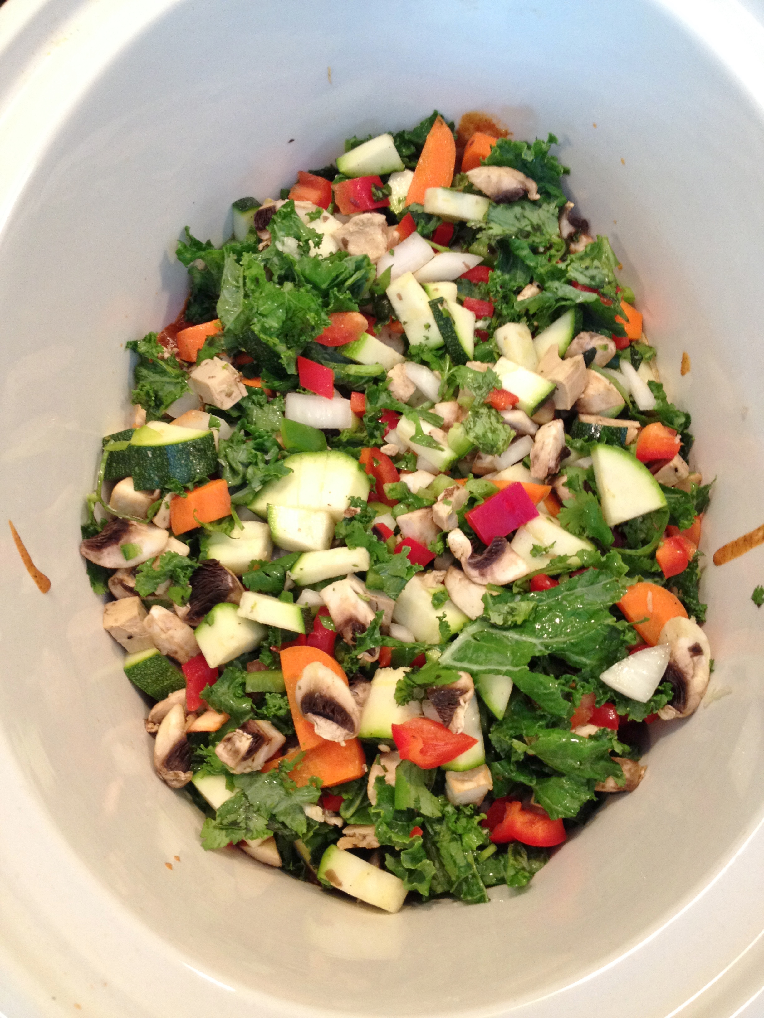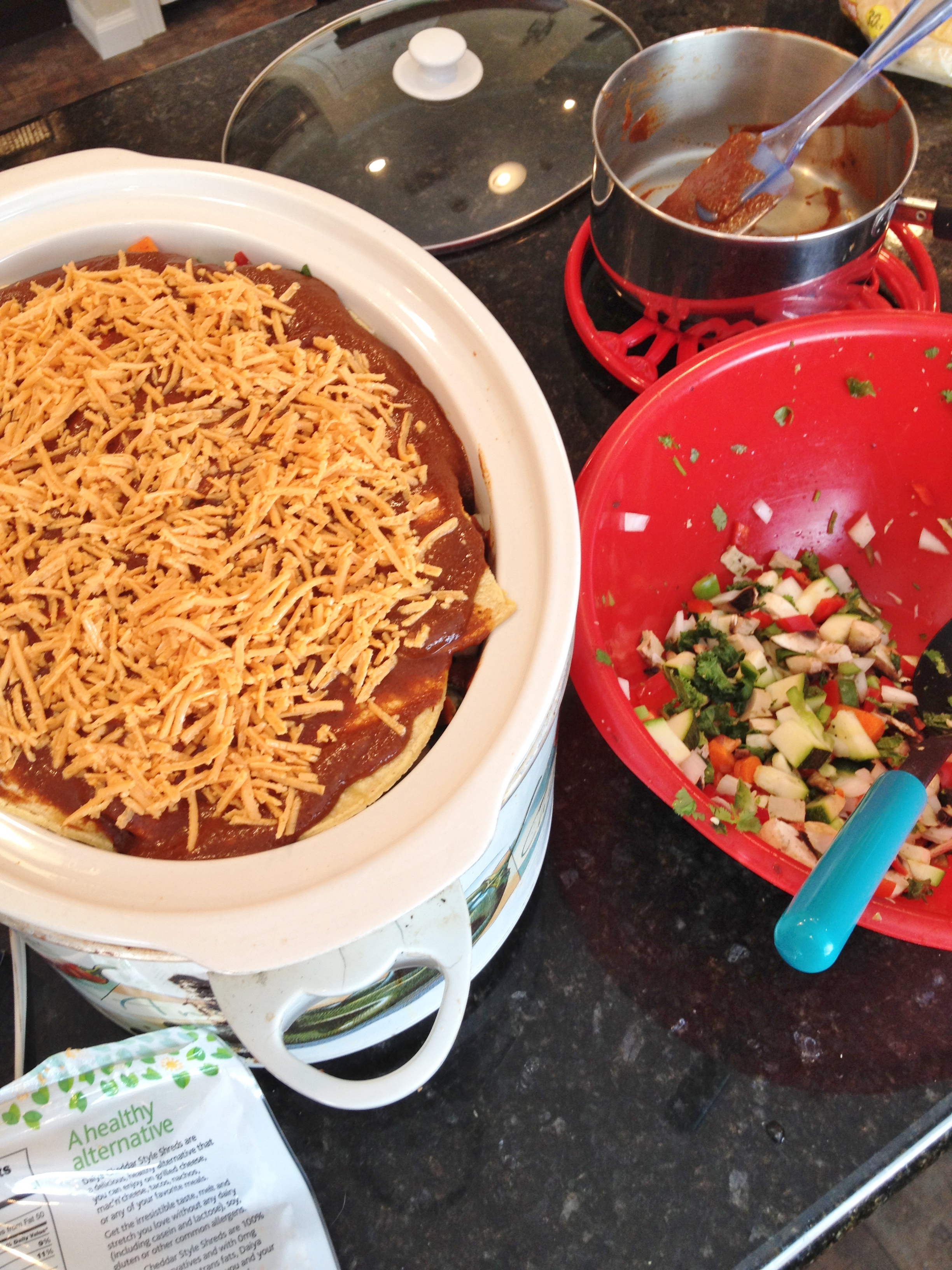 I have made this a few times before many, many years ago, but it was always in the oven and never full of veggies. It was always made with real dairy cheese and meat-less meat, and tons of tortillas and canned sauce. Meaning full of fat and tons of calories. This one is full of homemade enchilada sauce which I mixed a little with garlic-chive cream cheese (yum, I love this cream cheese!) and a huge bowl full of veggies. Like more veggies than fit in the crockpot. I used only four tortillas per layer, which may seem like a lot but if I had make this in the oven I would have had to use two pans and a ton more tortillas. In the slow-cooker I didn’t use all that much cheese – in a normal enchilada anything I use tons of cheese. In this only about a cup!