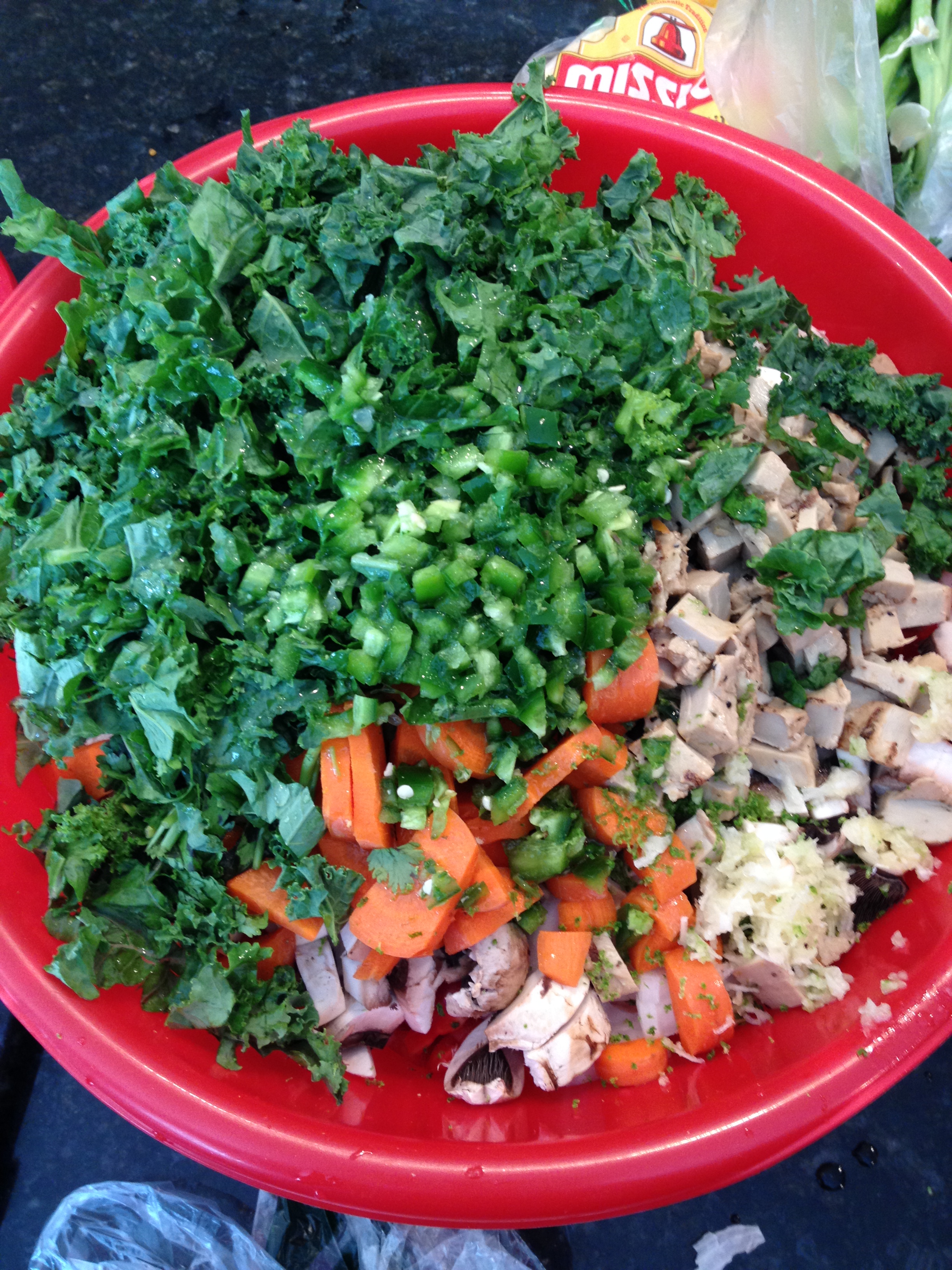 4. In the bowl with veggies add the minced jalapeno, garlic, cilantro, and lime and mix with spoon.