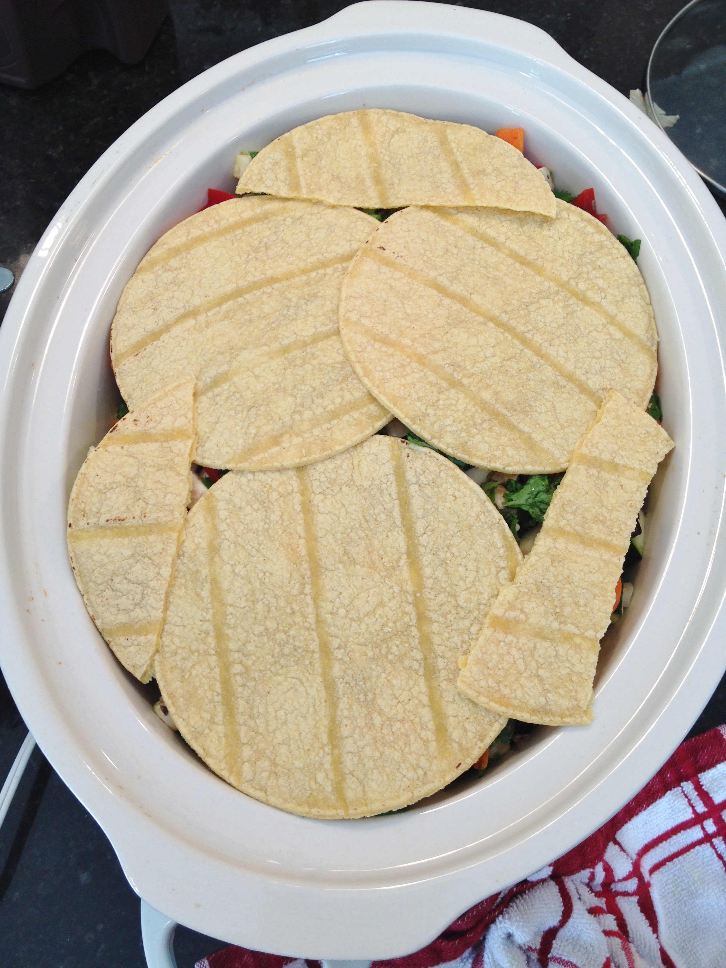 6. Start layering 4 tortillas then a 1/3 creamy sauce, then veggies. Layer until crockpot is full.