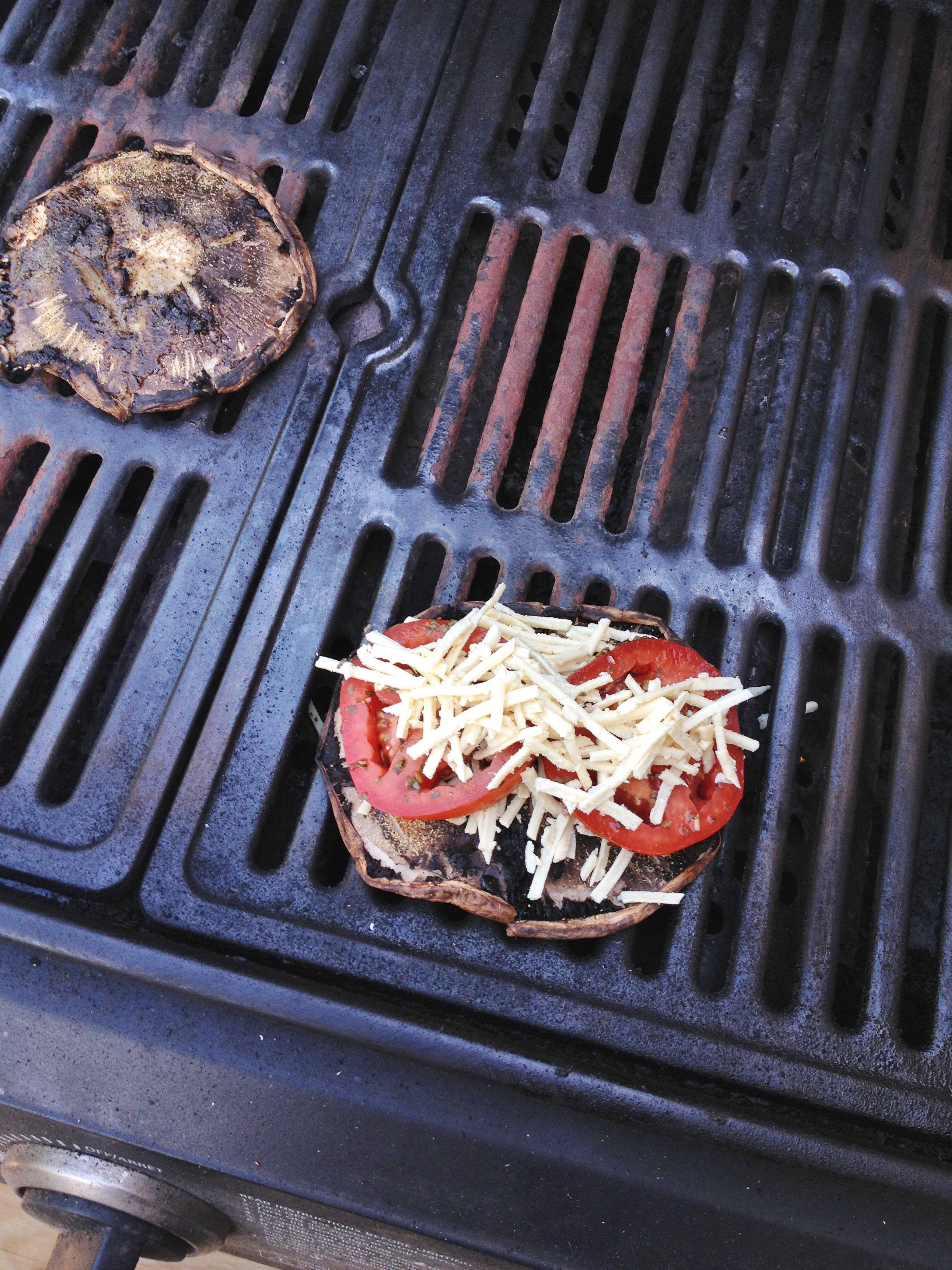 5. Let cook then layer cheese, tomato, and cheese onto one mushroom. Lay other mushroom and top and press down.