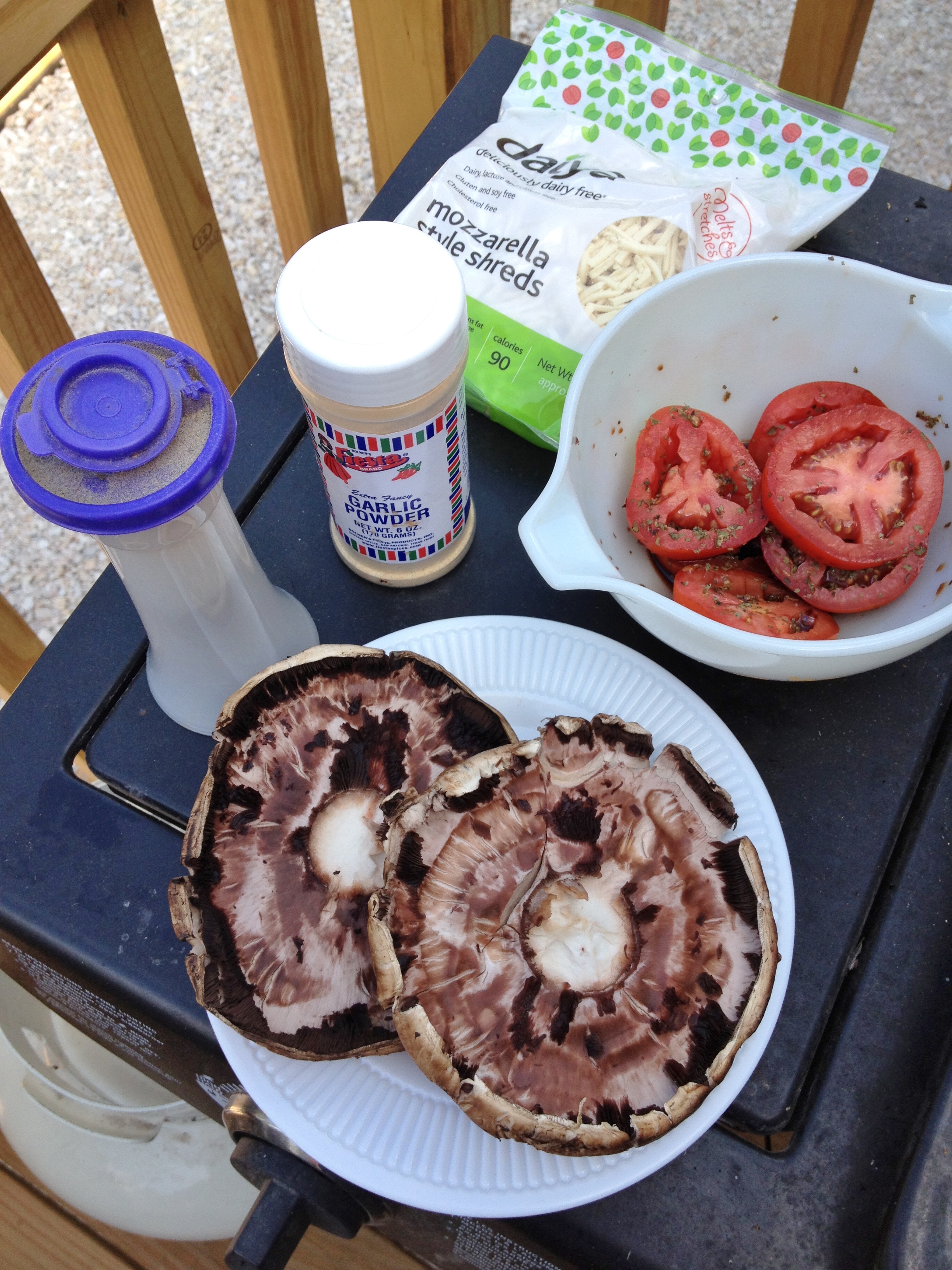 About an hour before starting the grill chop a tomato and sprinkle with dried basil and balsamic vinegar – I used two roma tomatoes and I only used two slices, so I just ate the others. For just one burger only buy one roma tomato. When ready, turn the BBQ on and get everything ready. Scrape out the ribs of the mushrooms with a spoon and wipe of the caps with a wet paper towel. Sprinkle garlic powder and black pepper over the inside of the ‘shroom and lay down on the grill. Close lid and let cook – I didn’t really know how long to let it cook, so I just winged it – but, it was about 5-8 minutes or so. Flip the mushrooms and let cook a couple of minutes then sprinkle cheese on one mushroom then layer with tomatoes then more cheese. Lay other mushroom on top of the cheese and press down. Let cook then carefully flip and cook a little more until cheese is meltyish. No bread needed for this filling burger! Enjoy!~