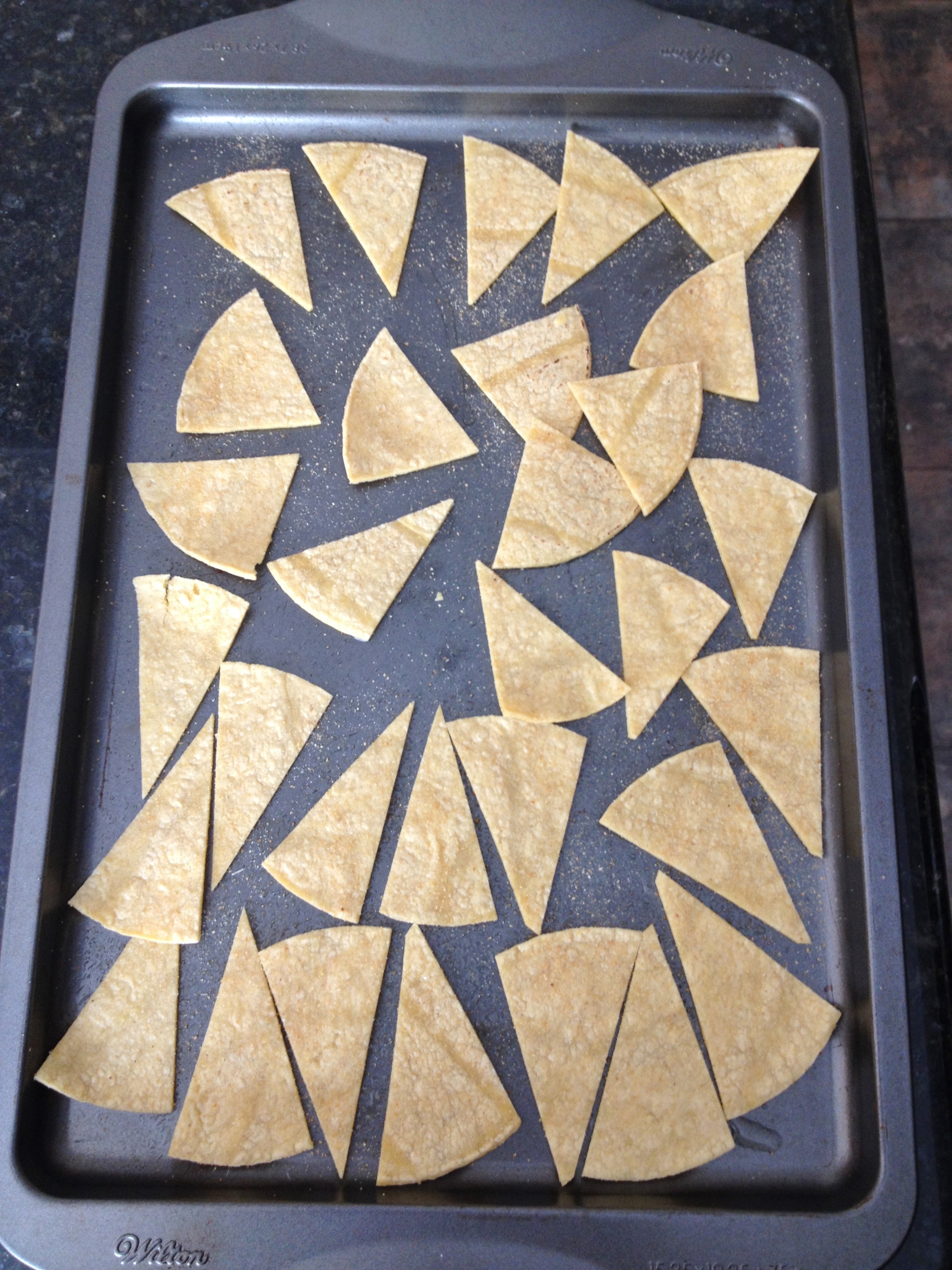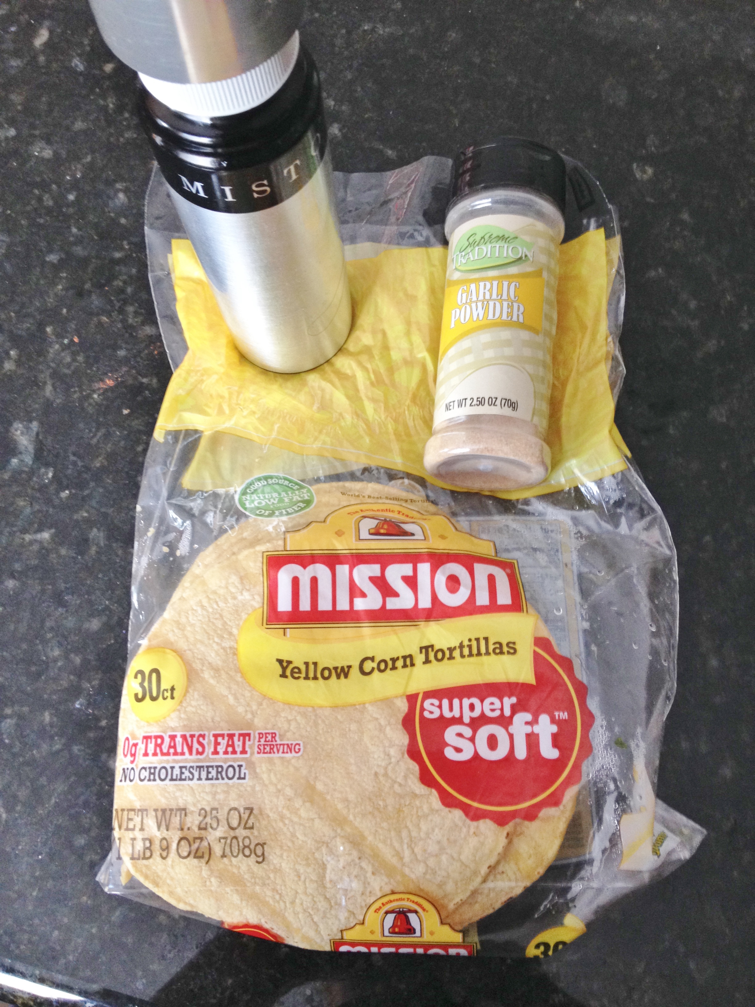How do you make a non-fried chip? Kind of self explanatory – you just don’t fry it, you bake it! Cut your corn tortillas and spritz them with a little olive oil and douse on some garlic powder and there you go! Awesomeness! I make these little chips a lot when I am need of some crunch and am fighting the urge to buy something unhealhty. I keep tortillas in my fridge just for this purpose. Just be sure to only cut up a couple tortillas not the whole package or else you may eat all the goodness in one sitting! Oops.