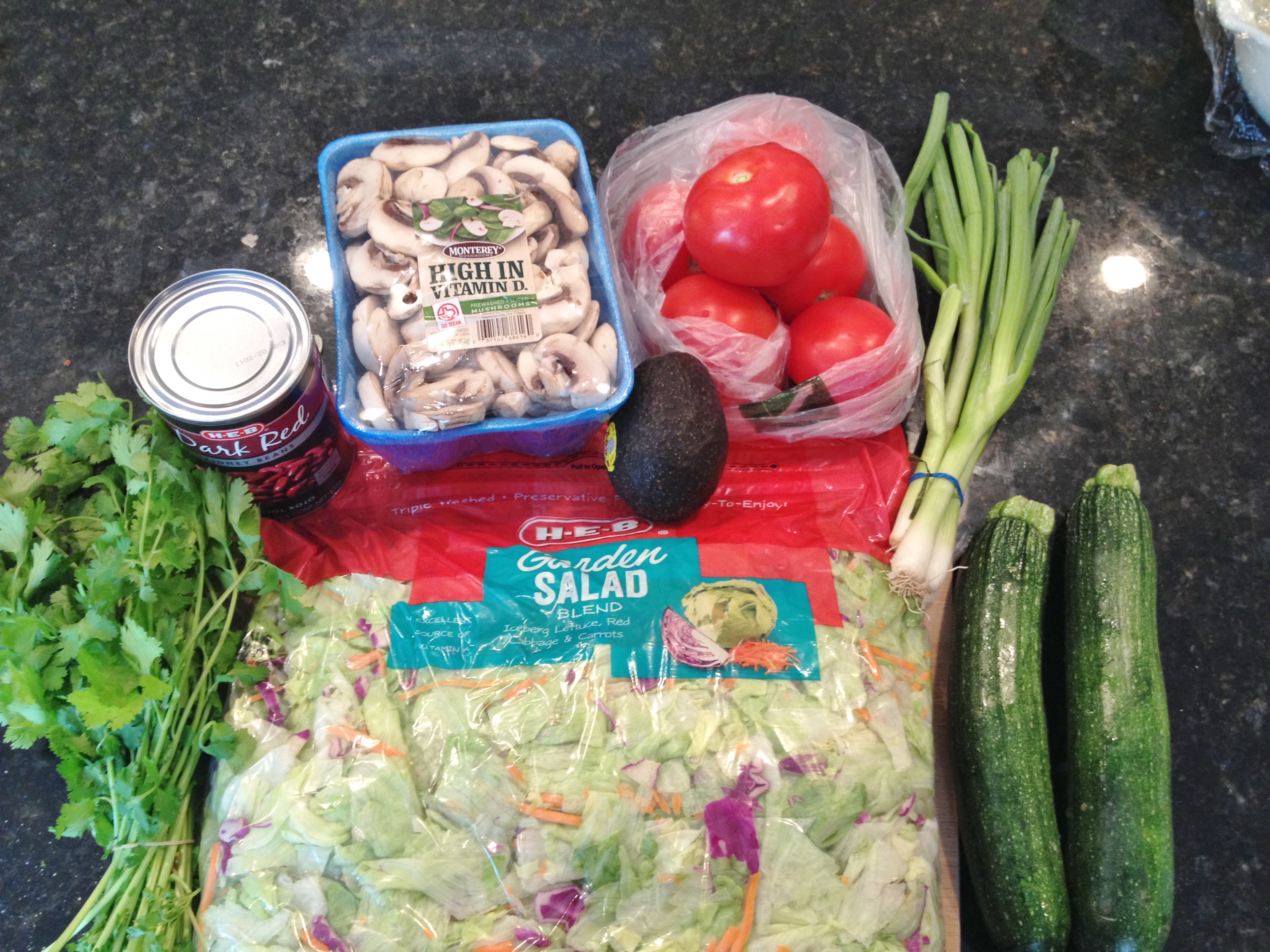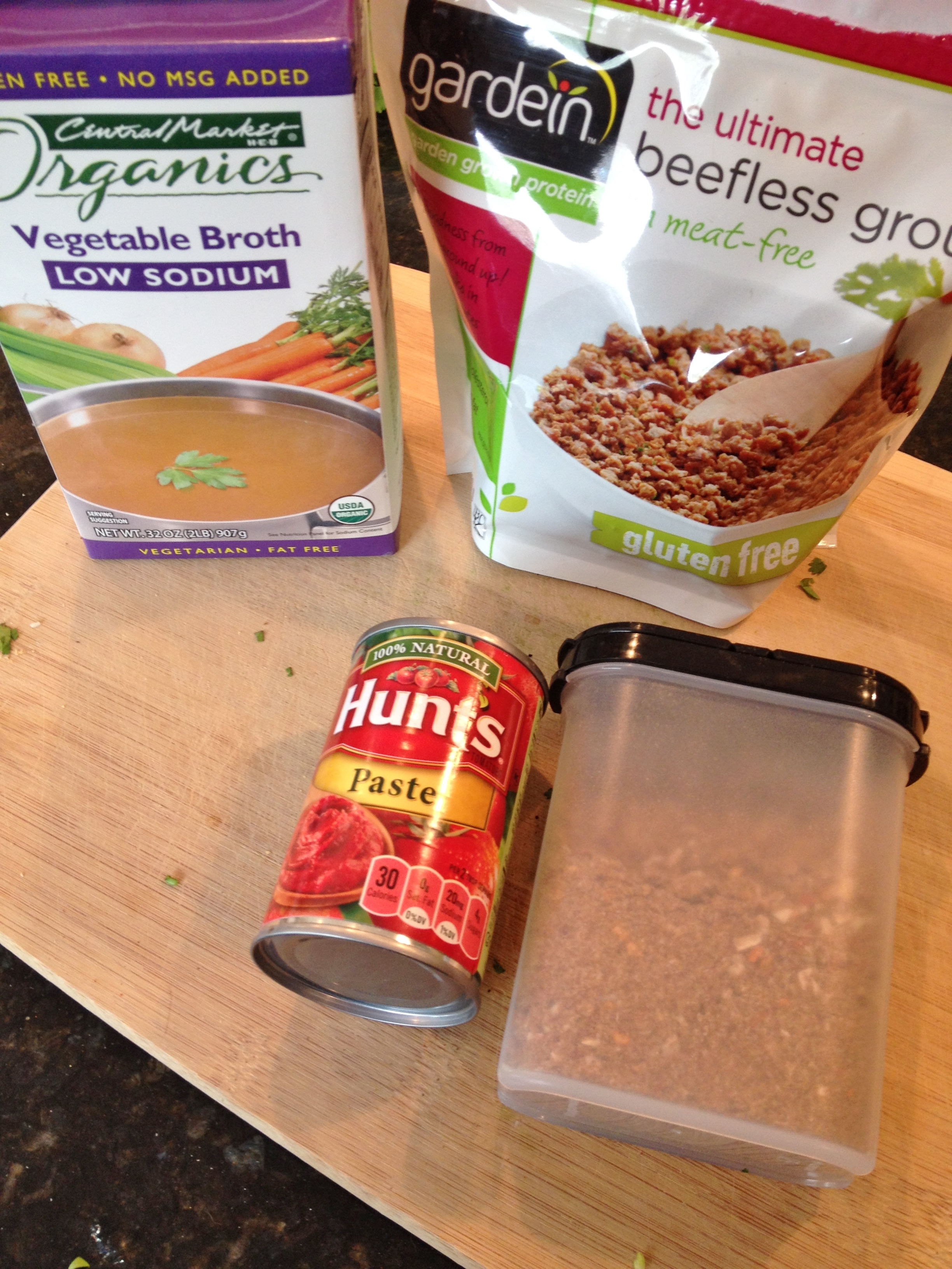 So the good thing about salads? They are super easy! The “meat” is simple, just heat a pot with the stock, tomato paste and taco seasoning until boiling then add the beefless ground. Heat through then turn off the heat and let sit. Cut all your salad veggies and portion out and make your meal. Add the cooked taco meat on top and add some chips. Super. Easy! Enjoy!
