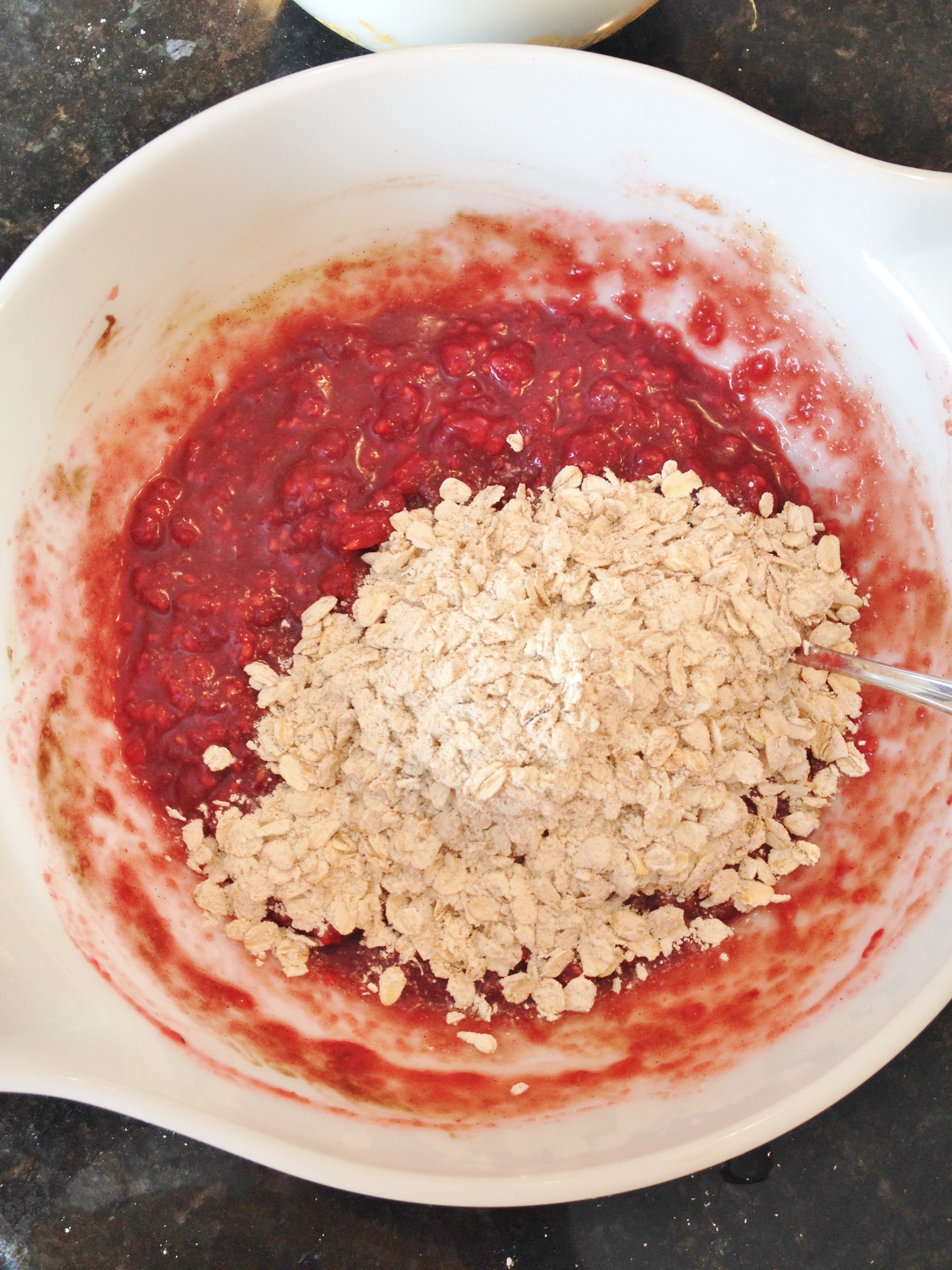3. Toss all wet ingredients and raspberries in larger bowl and mash together.