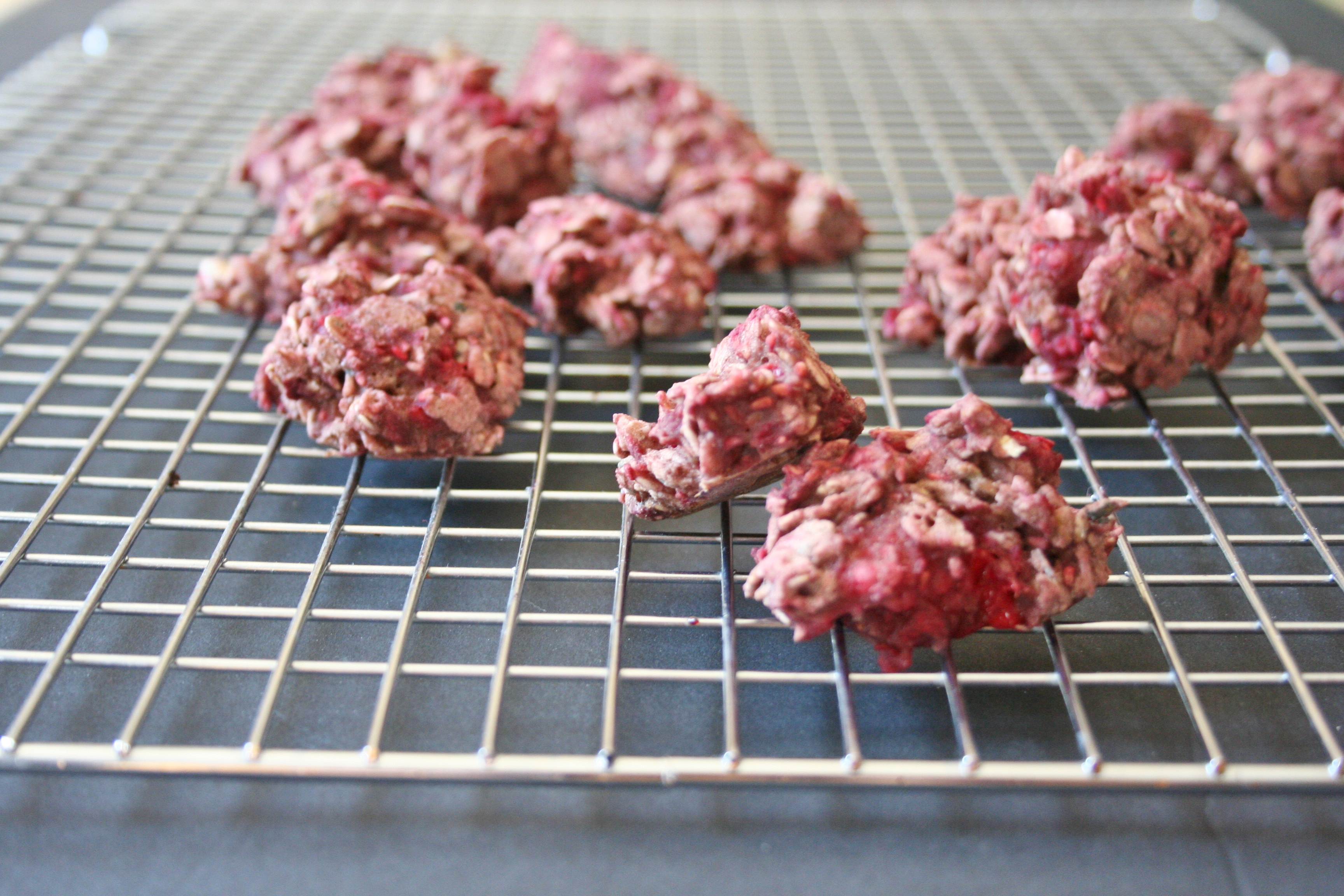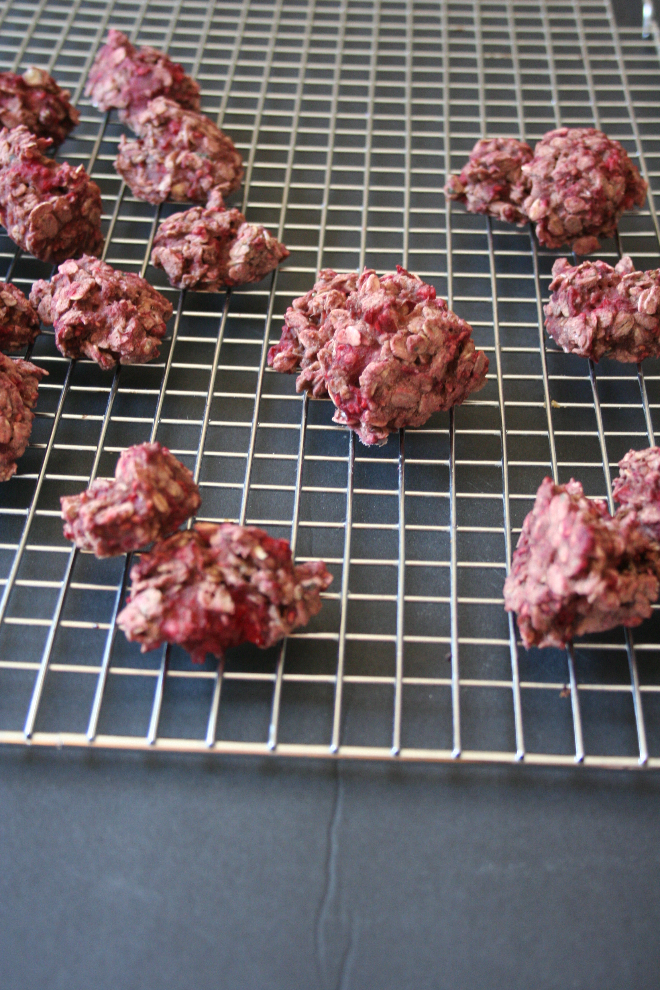 First heat up your oven then dump your dry ingredients into a smallish bowl and mix. In a larger bowl pour your wet ingredients and raspberry and mash together with a spoon. Add your dry ingredients a little at a time and mix. These are meant to be small-bite cookies, so use a teaspoon to portion out the cookies. Bake at 350 degrees for 10 minutes. Let them sit and cool a little before devouring … or pacing yourself and eating randomly. Enjoy!