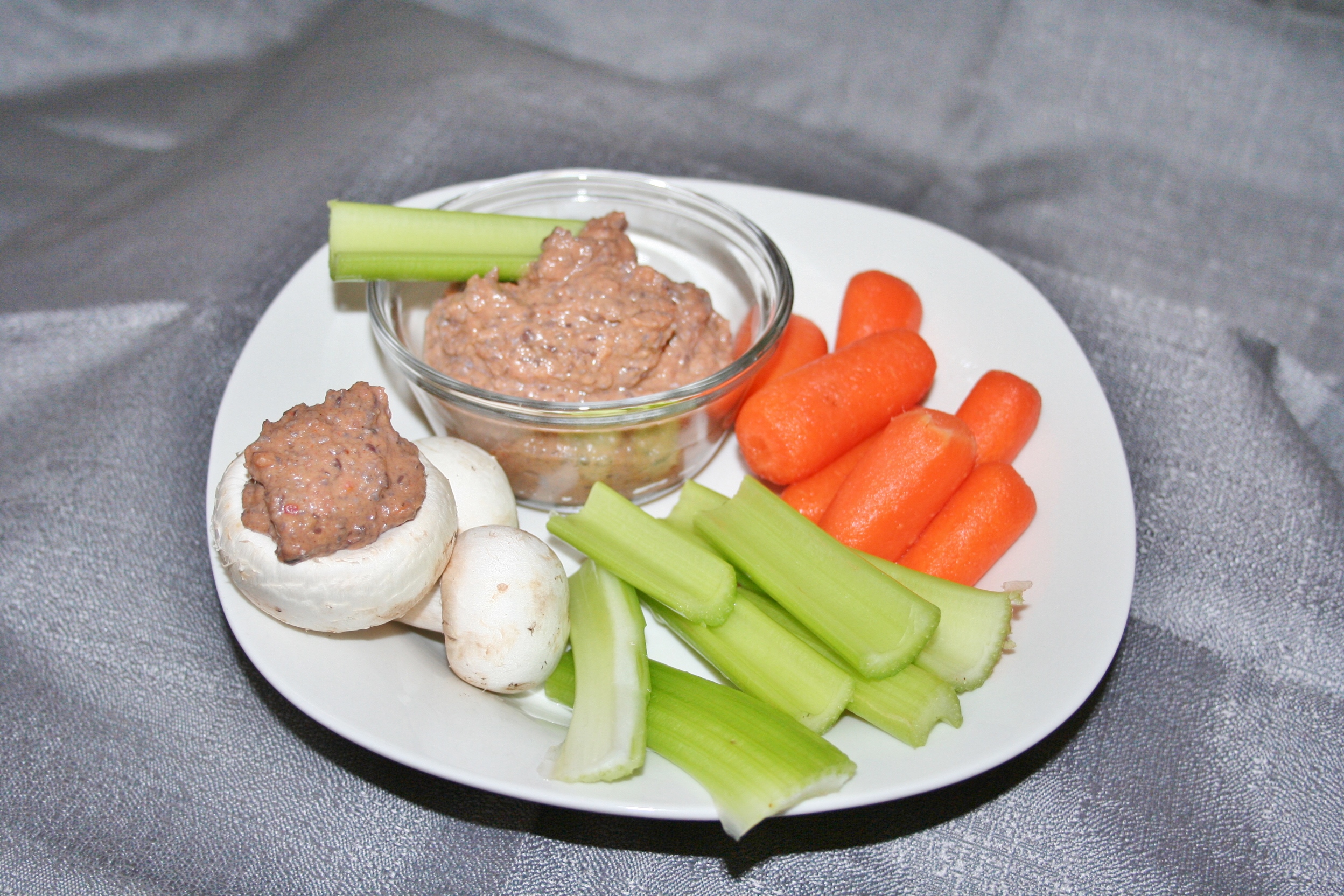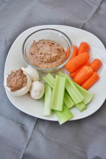 Best thing about hummus is that it is easy to get everything together and get blended. I soaked dried beans overnight then boiled them all, following the directions on the bag. Then I measured out the beans and dumped into the food processor and froze the rest to save for a future recipe. Cut tomatoes into slices, measure out and dump in taco seasoning then mince in garlic. Turn on then pour in two tablespoons oil. Mix until smooth and creamy then enjoy with crudites!