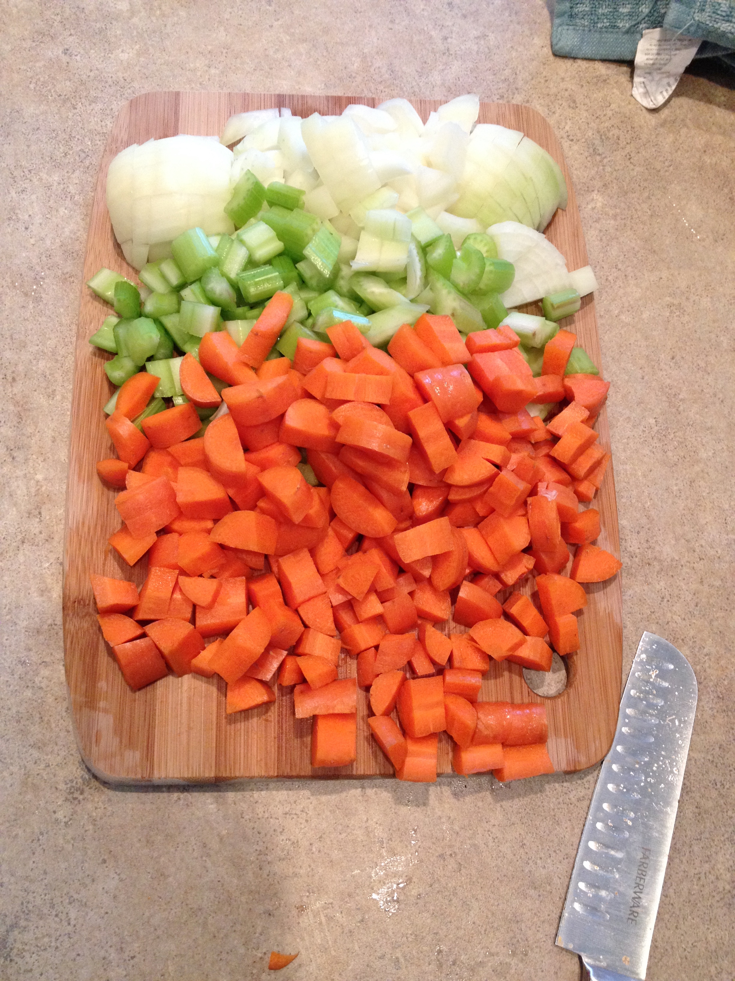 5. Chop onions, celery, and carrots and add to pot with half the second container of stock.
