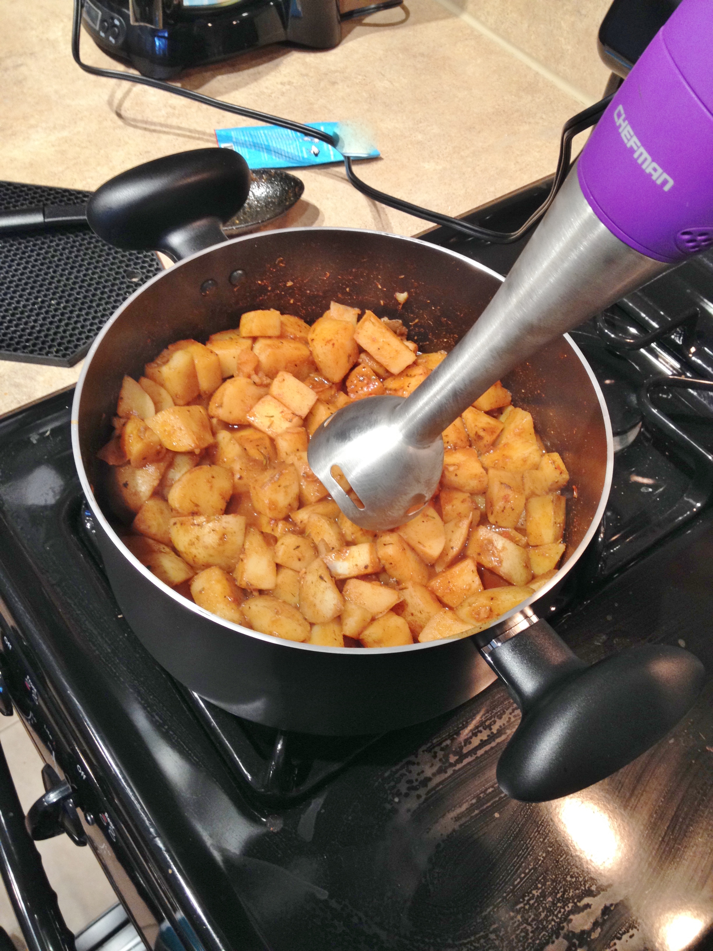 1. In a large pot dump chopped potatoes, one container of vegetable stock, minced garlic, and all spices.