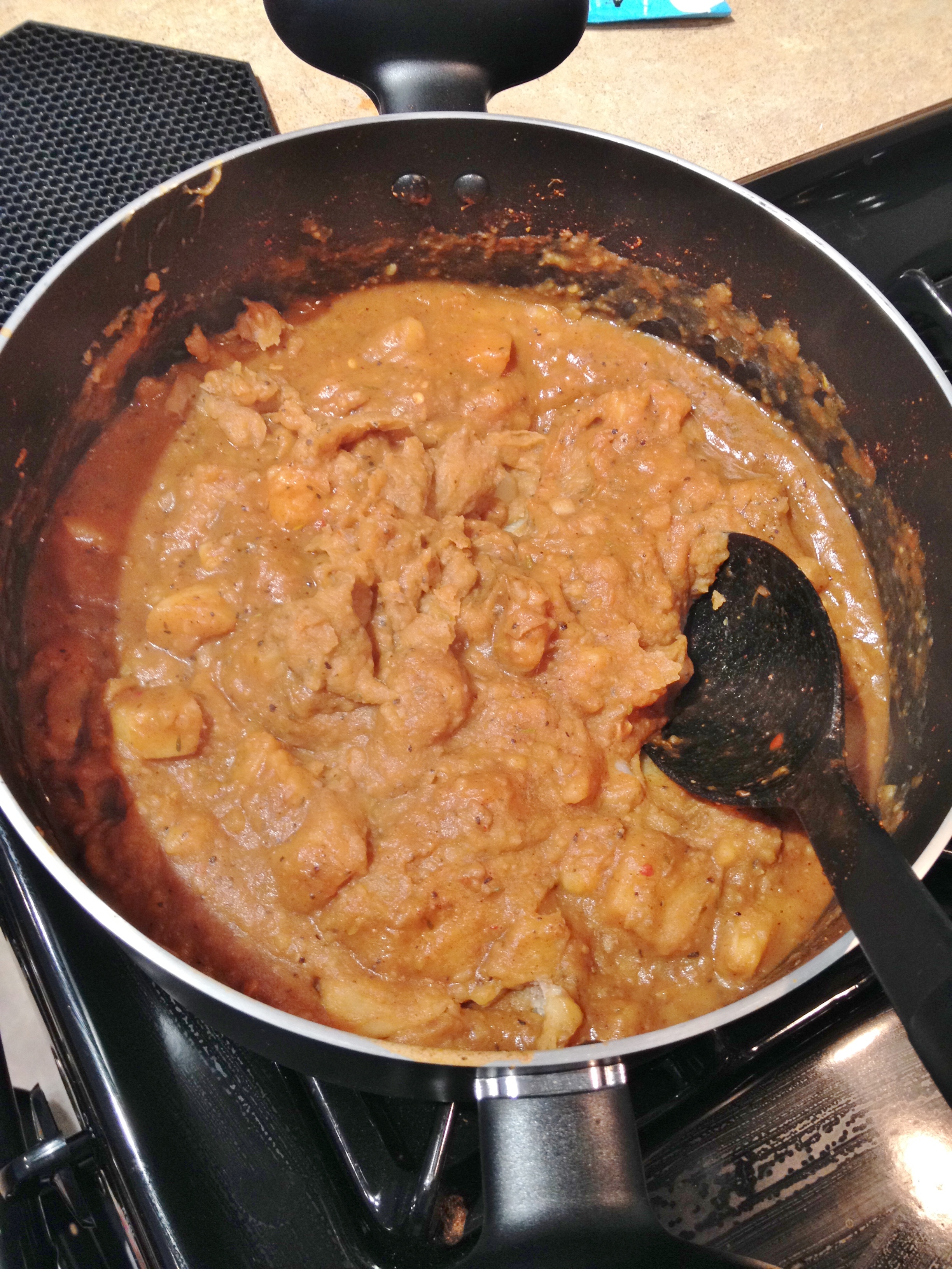 I used to love eating canned clam chowder – the thick, creamy and oh-so potatoey soup, but since going veg I have not had it or really any potato soup, in a long time. Another soup I loved was the Marie Callender’s potato cheese soup – oh man, talk about cheese and potato goodness right there. But both of those have many things I don’t want or need – calories and sodium mainly, along with cream, flour, cheese, clams, etc. My potato chowder is made up of lots of spices and potatoes, some veggies for an extra kick in the healthy department and that’s about it. A simple, good for you soup to get you through the cooler days. And the most awesome part of the soup? The thickening of this soup! You mash the potatoes! Now this may seem kind of obvious to some, but having never thought about making a chowder before I didn’t know how to get the thicker consistency of the soup without going the flour/cream soup route. But, my new tool, the immersion blender prevailed and mashed potatoes happened!