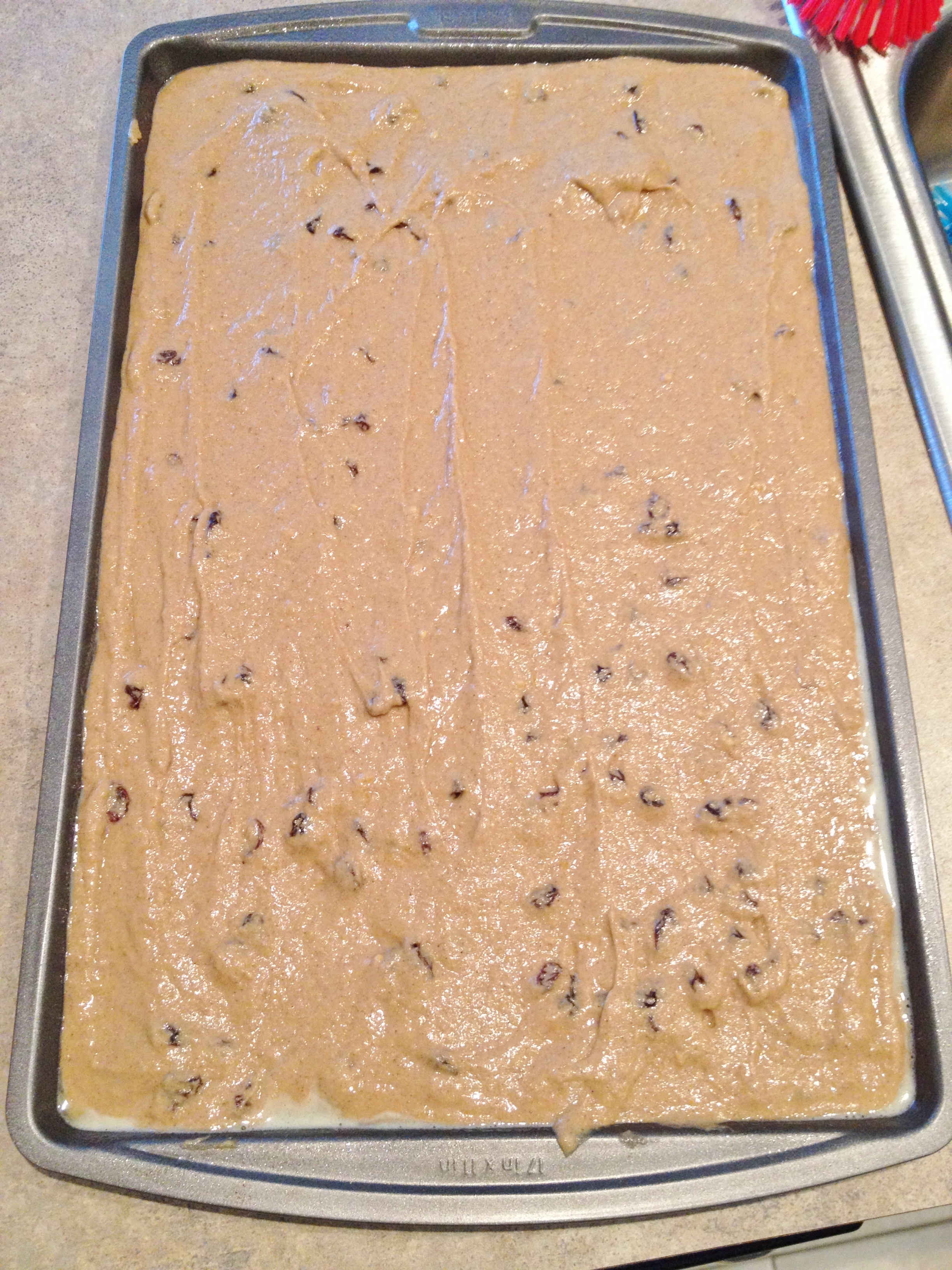 8. Spray a baking sheet with non-stick spray then pour in dough and spread out evenly.
