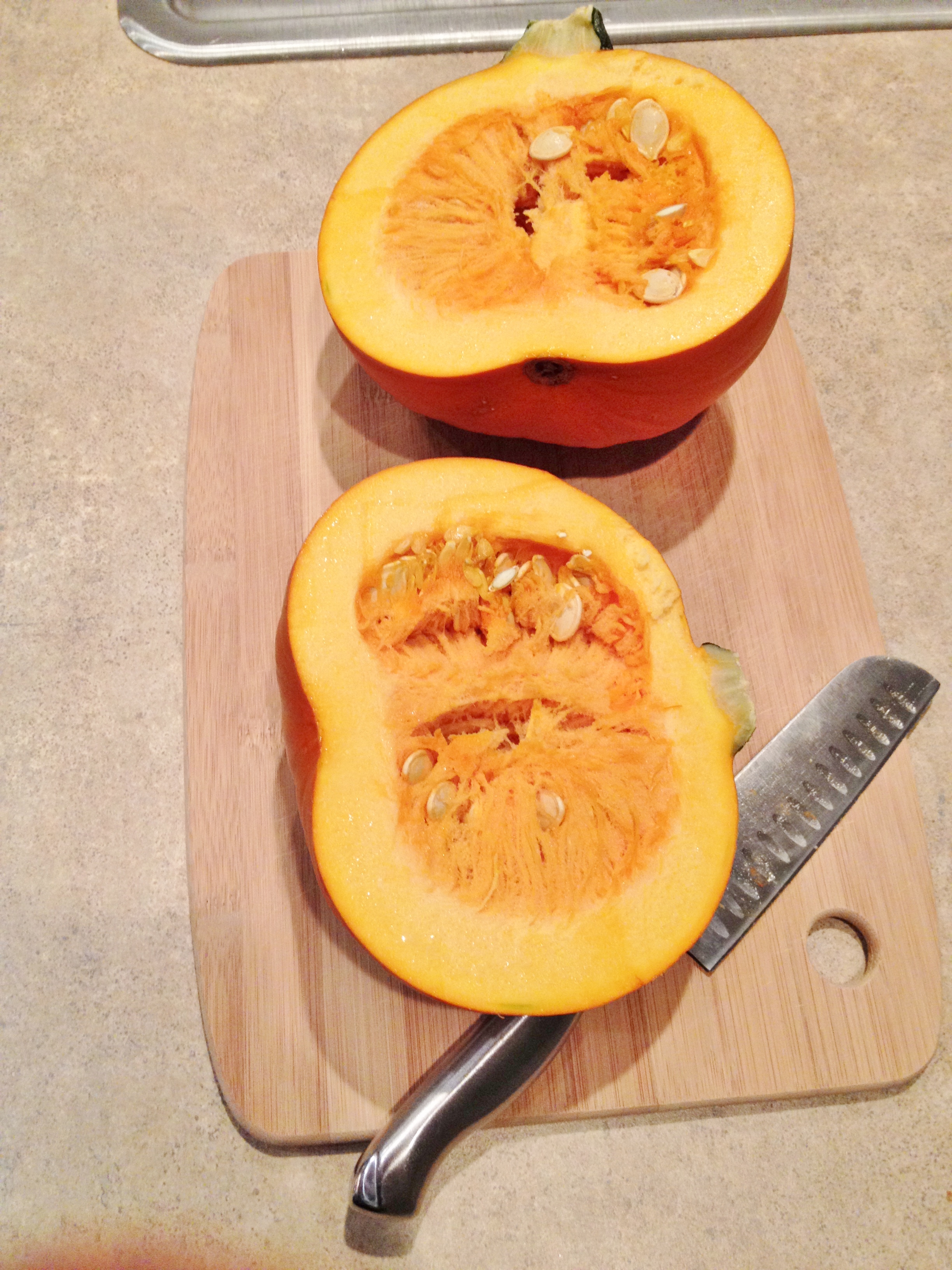 1. Roast a fresh pumpkin at 375 degrees for 45 minutes – wash pumpkin then cut in half, scrape out seeds, spread butter over entire inside and sprinkle with cinnamon, lay face down and bake.