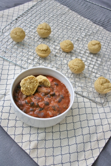 Mini-muffins! Yum, I love cornbread so much. I really enjoy it smothered in butter and honey. But I decided that this chili also needed some mini corn muffins, minus the excess butter and sweetener. What could be better than spiced muffins with chili? And a super thick chili that is packed full o’veggies? Yum. And this chili is the best way to hide an uncertain veggie from uncertain people. You won’t even know it’s there, and it adds super thickness to this chili and even though a whole carton of stock was used, this turned out super-duper thick. So good, especially with the thickness of the cornbread muffins crumbled into the chili. Gosh, yum.