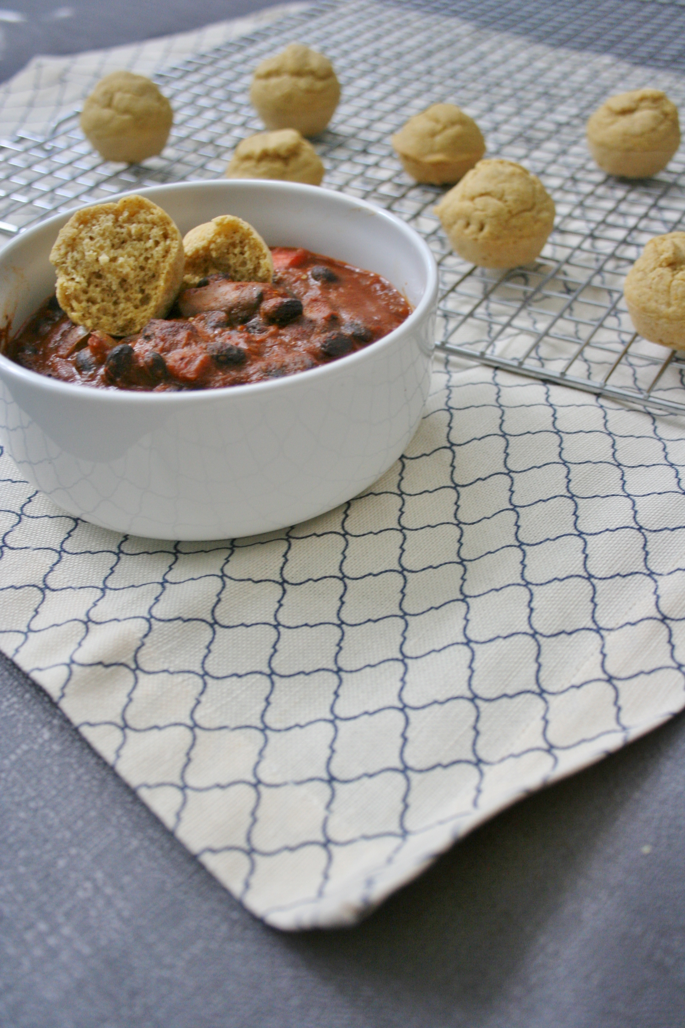 I am coming to love Fall veggies. Butternut and pumpkin are becoming my new fave roasting veggies. Although I don’t necessarily love the flavor of squash on its own, I love adding it to a recipe to boost my veggie quotient and orangey squash gives me the vitamins that I don’t always get in the other foods I eat. I am also a lover of all things enchilada and since its Fall why not make a chili? Here is my vegan and gluten-free Butternut Enchilada Chili with Cumin Cornbread Mini-Muffins.