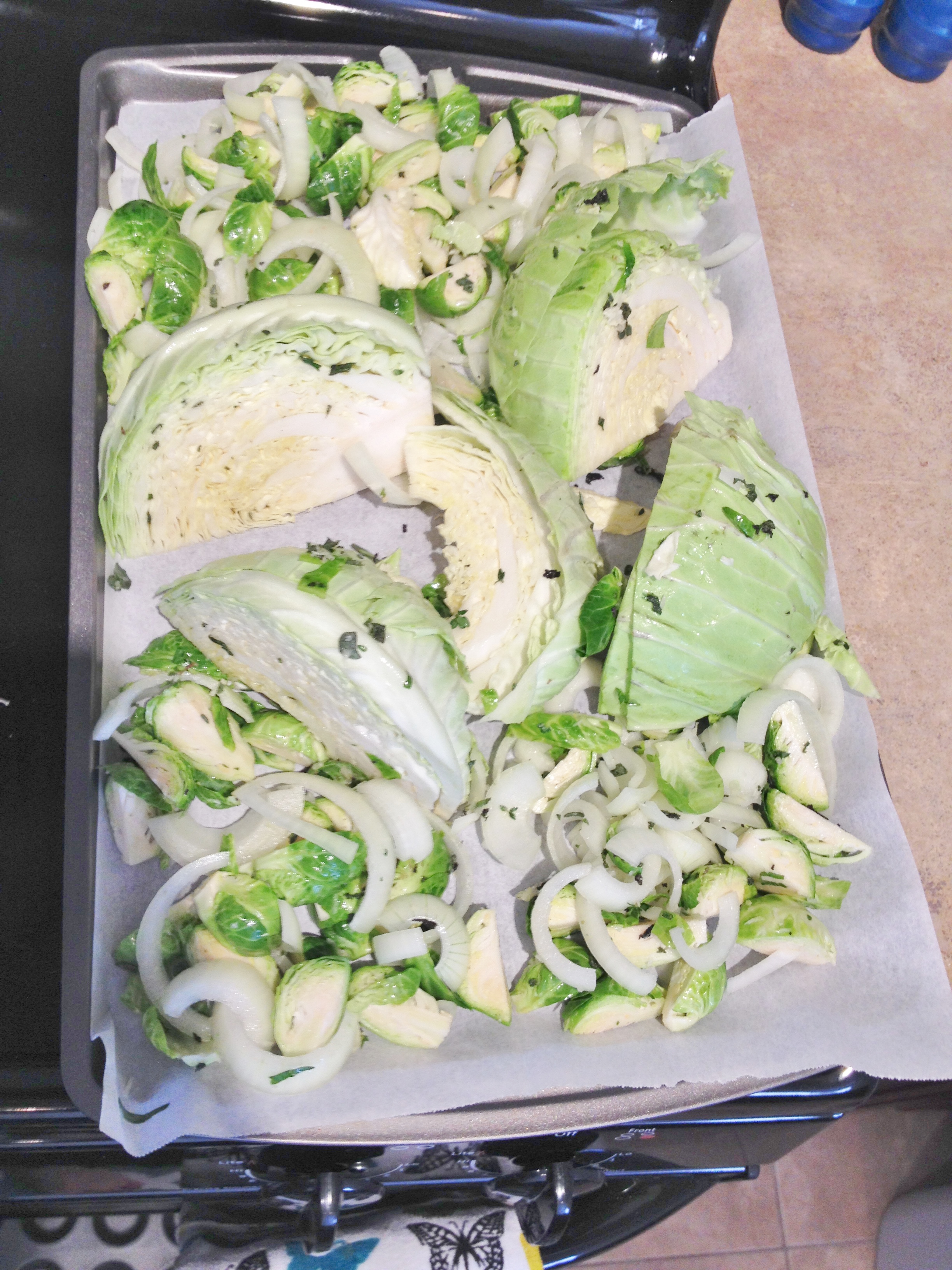 Start by washing the Brussels sprouts and taking off any outer leaves then slicing in half. Slice the onions in half then slice into thin strips. Line a baking sheet with tin foil then dump the sprouts and onions on the sheet then sprinkle a couple tablespoons oil over the veggies then mix with your hands. Sprinkle half the herbs over the veggies then mix again. Take the outer layers off the cabbage then quarter. Lay on the baking sheet and sprinkle the last of the oil and herbs over the cabbage, rubbing the oil all over the cabbage. Don’t slice the core out of the cabbage, let it hold it together during baking. Bake at 375 degrees for 20 minutes then turn the cabbage and mix the other veggies. Bake another 20-25 minutes. Let cool a little then slice the core our of the cabbage. Enjoy!