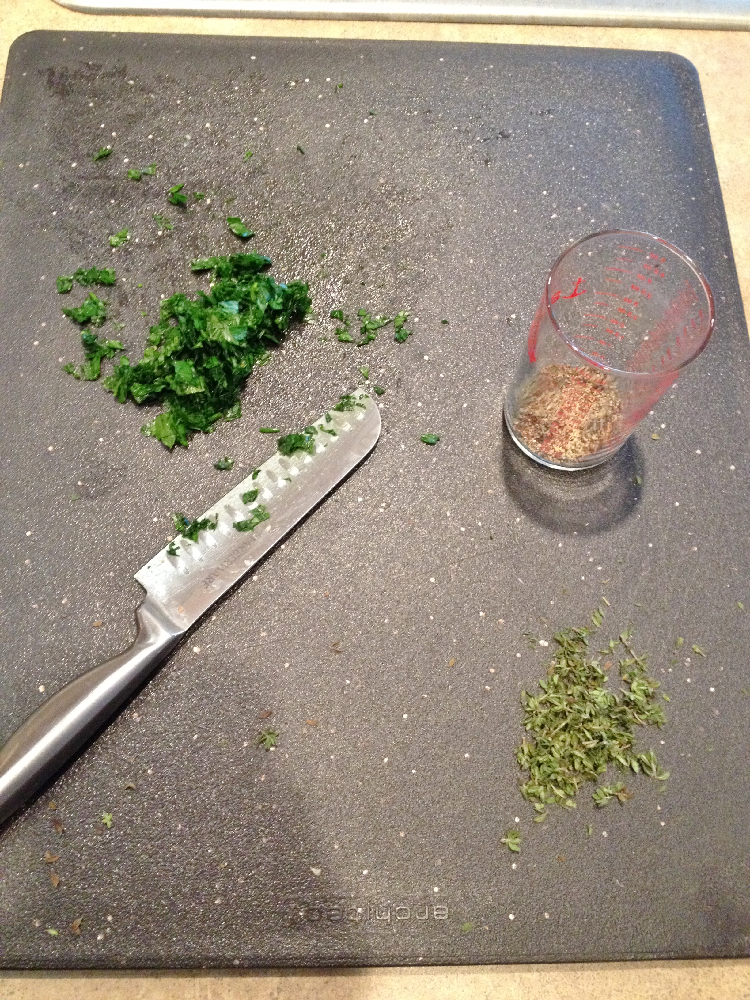 I started by halving two large onions and slicing thinly, then sauteing them in vegetable broth with the lid on to soften them then with the lid off to give them color and flavor. While those are working chop up the mushrooms and celery and mince the garlic and clean the green beans. The beans will not get cooked before baking, they will cook in the oven and still have a wonderful crunch when all done – not mushy like the normal canned casserole beans. Once the onions are done dump them into a bowl and set aside. Into the saute pan add mushrooms, celery, and garlic with a little broth and let cook down until almost no liquid is left, then dump into the bowl with the onions. While those veggies are cooking mince the parsley and thyme. Next pour the oil and flour into the saute pan and whisk the flour then add the broth, homemade worcestershire sauce, herbs and let thicken up and cook a few minutes. Add the onions and mushroom mix and mix. Pour over green beans and mix to coat beans. Bake at 350 degrees for 30 minutes then take out and carefully mix then bake 30 more minutes. Not your typical green bean casserole, but so much more healthful and gravylicious!
