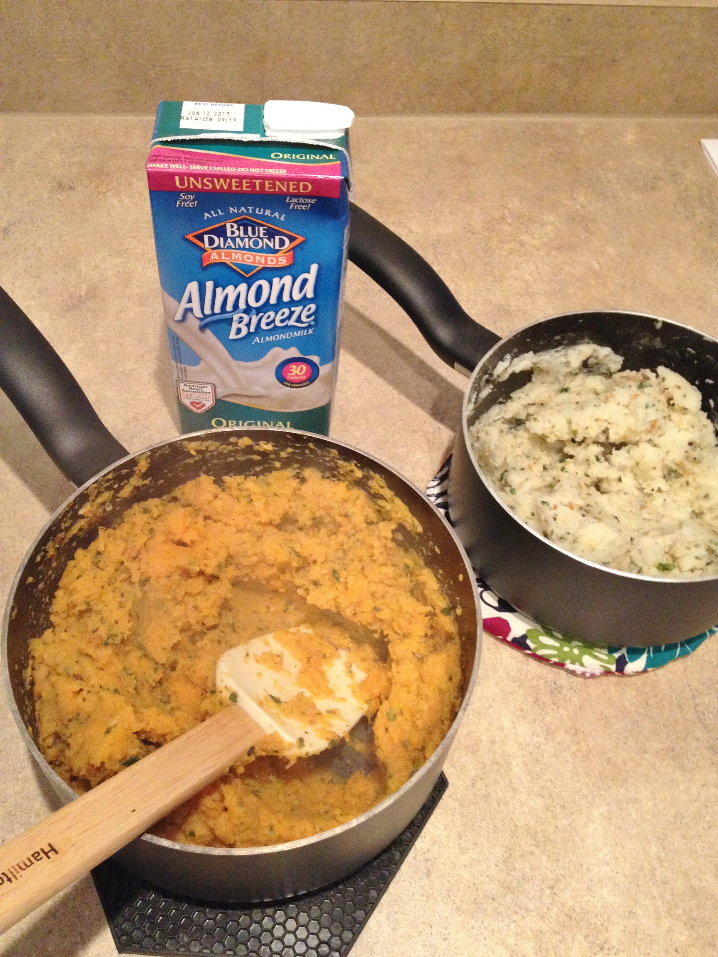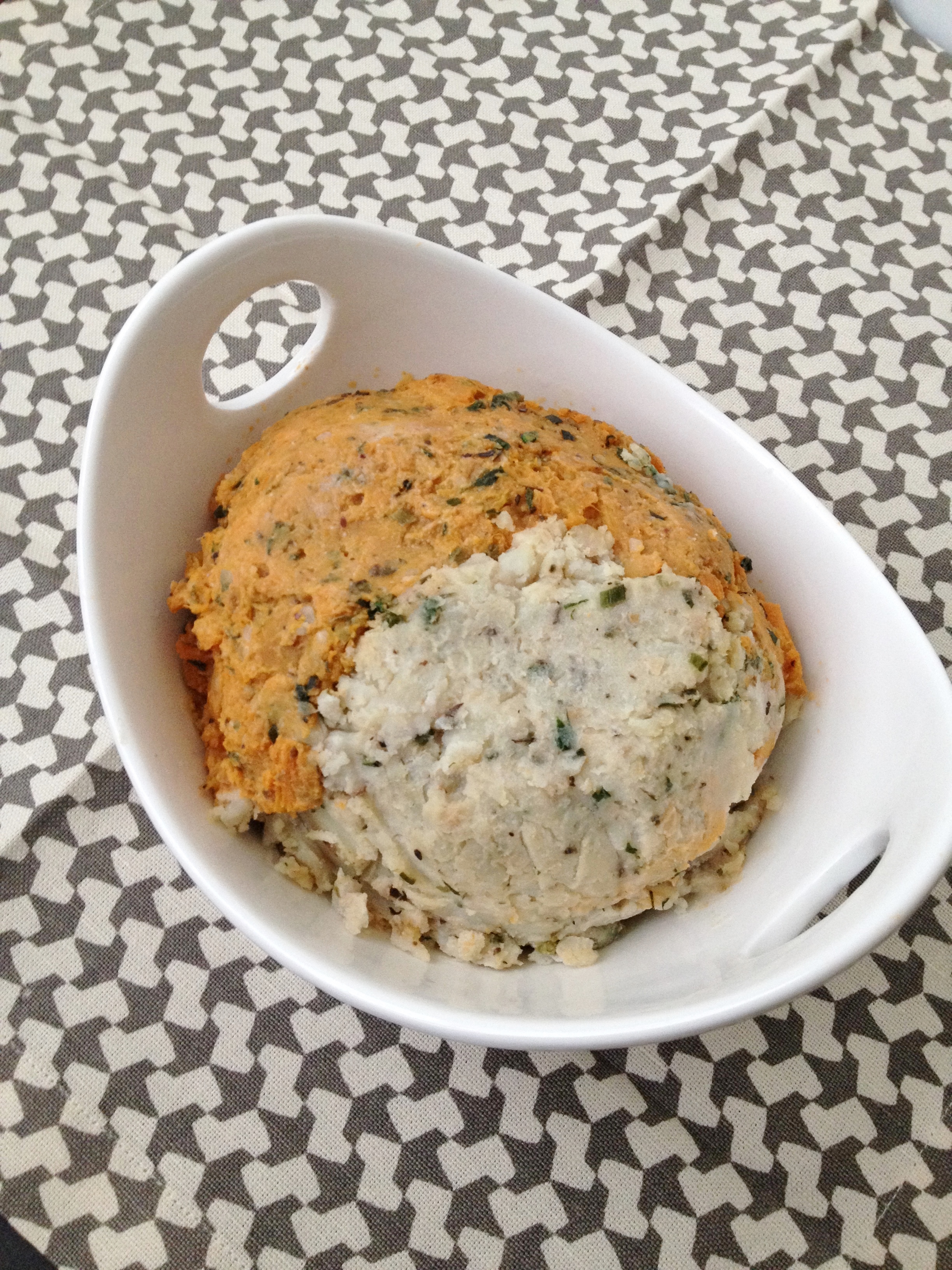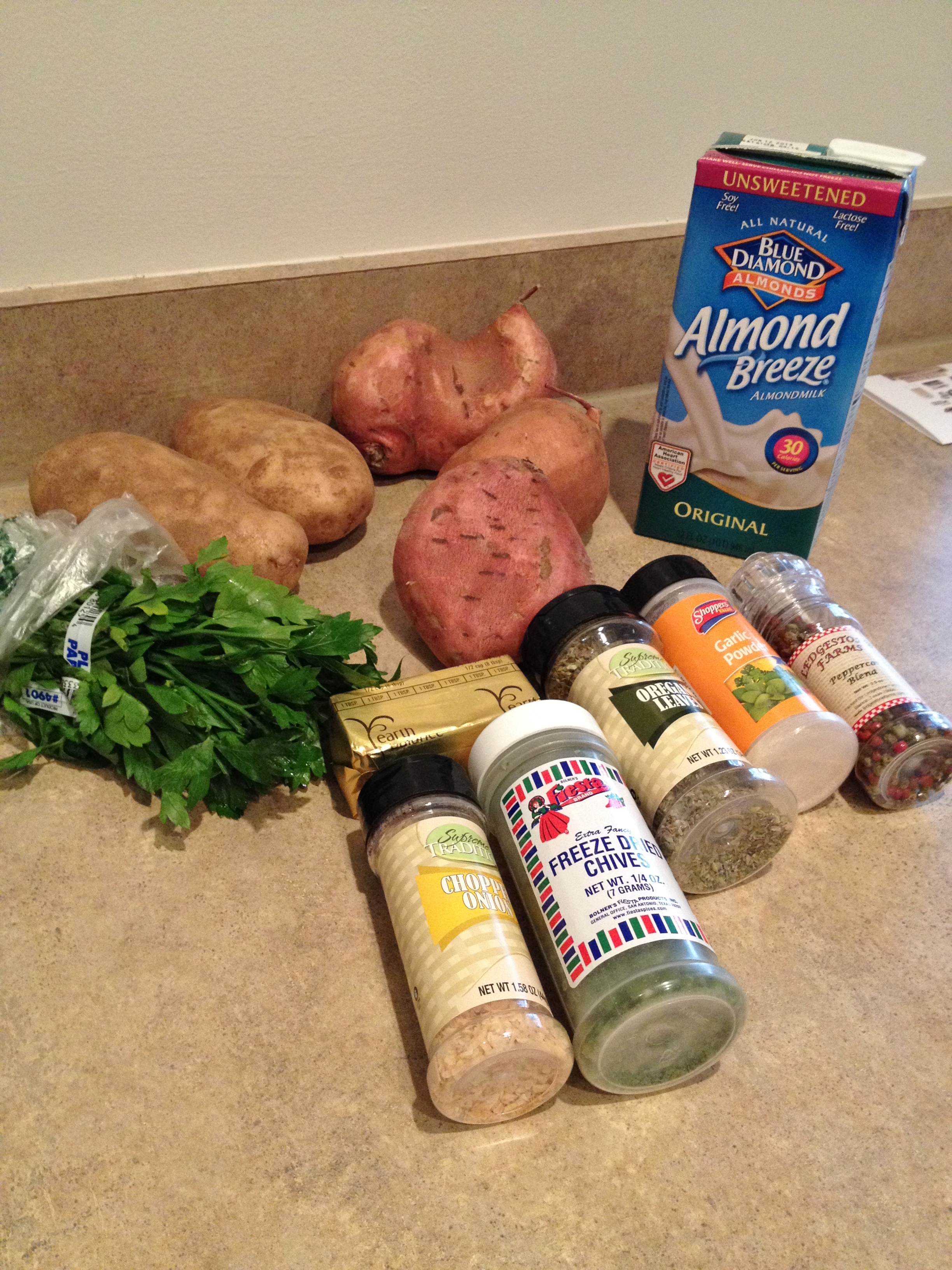 Mashed potatoes are so simple. Wash, scrub, and chop small your potatoes – equal amounts, though I ended up with a little more of the sweet. Bring to a boil then turn down so the pots don’t overflow and cook until potatoes are soft. While the potatoes are grooving chop and measure out veggies, then melt the butter in a small pan and add herbs to pan and mix. It will thicken up which is fine, you are just waking up the dried herbs and wilting the fresh. Let sit on low heat until potatoes are done. Drain one pot of potatoes then mash with milk, then add part of the herb mixture. If you have equal amounts of potatoes halve the herb mixture and add to both sets of potatoes. Add to mashed potatoes and mix. Drain other pot, mash with milk, add rest of herb mixture and mix. Plop both into a dish and enjoy!