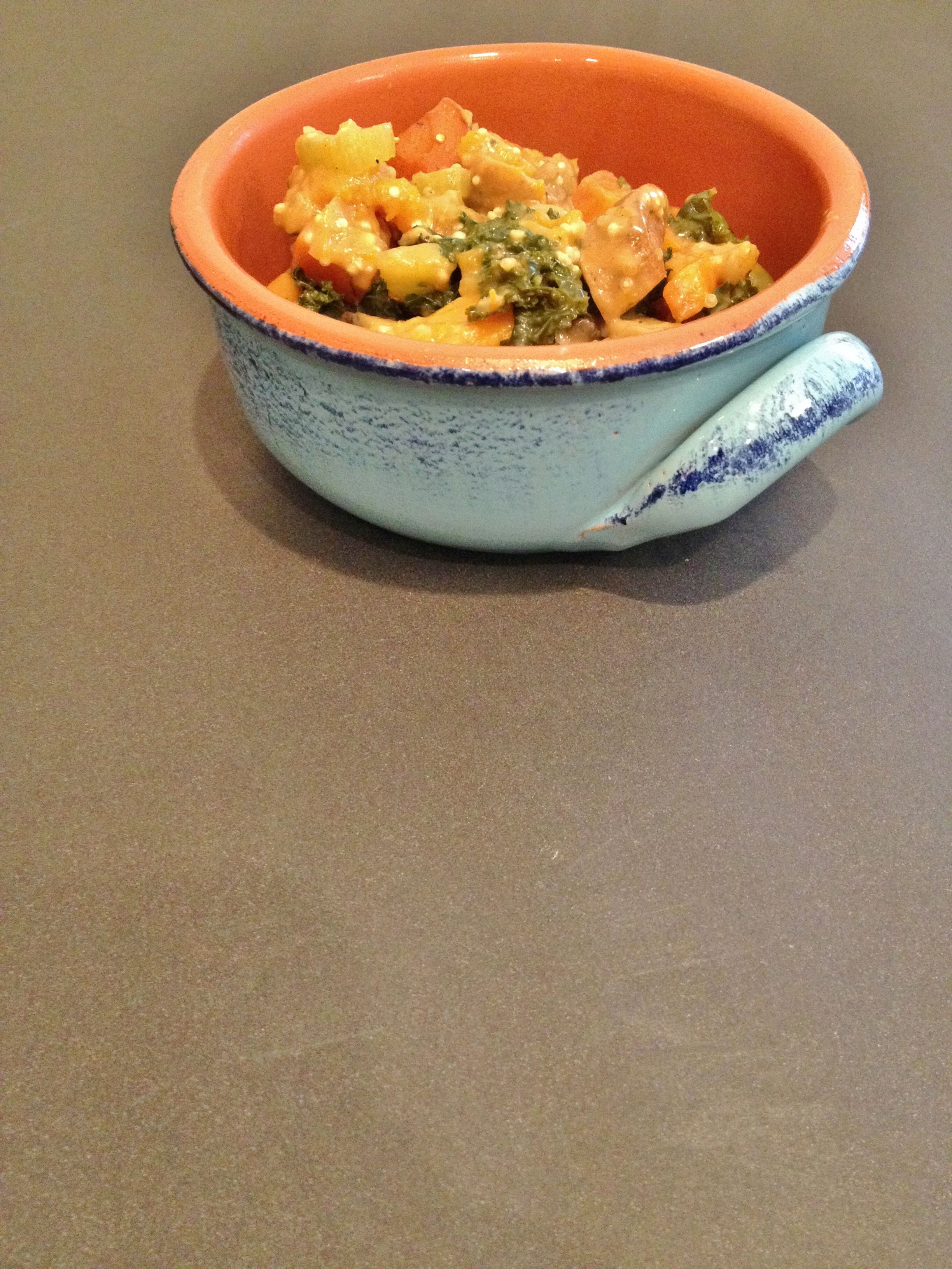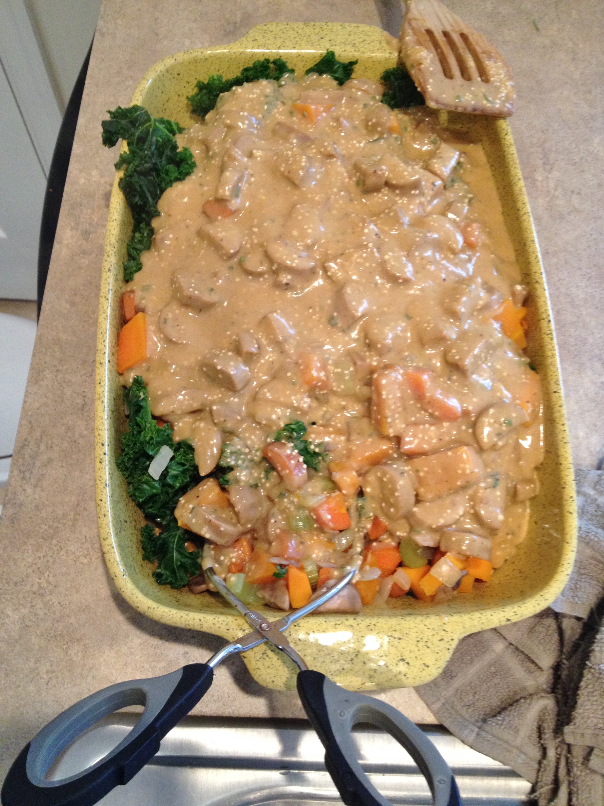 Start by chopping the onion, celery, carrots, garlic, and mushrooms then saute with broth in a large saute pan over medium-low heat. While that is cooking, slice off sides of butternut squash and chop into small pieces and add to pan, stir and add a little more broth if needed, then put lid on. Wash up and chop kale; pour onion and squash mix into a large baking dish then add kale to the pan. Add stock and use tongs to move around. Put lid on to steam but be sure to mix so it doesn’t stick to the bottom and burn; only steam a few minutes, you just want to wilt the kale a little. Dump kale into baking dish. In pan add butter and melt then add flour and mix then add broth and let thicken. Add all spices, vinegar, Worcestershire, and tamari and whisk in. Add cream cheese and whisk gently in. Add in sausage and quinoa and mix to cover. Turn off heat and pour sauce mix over veggies and mix carefully in baking dish. Bake at 350 degrees for 55 minutes. And yes, the quinoa will soften up in the gooey sauce and everything will be so yummy!
