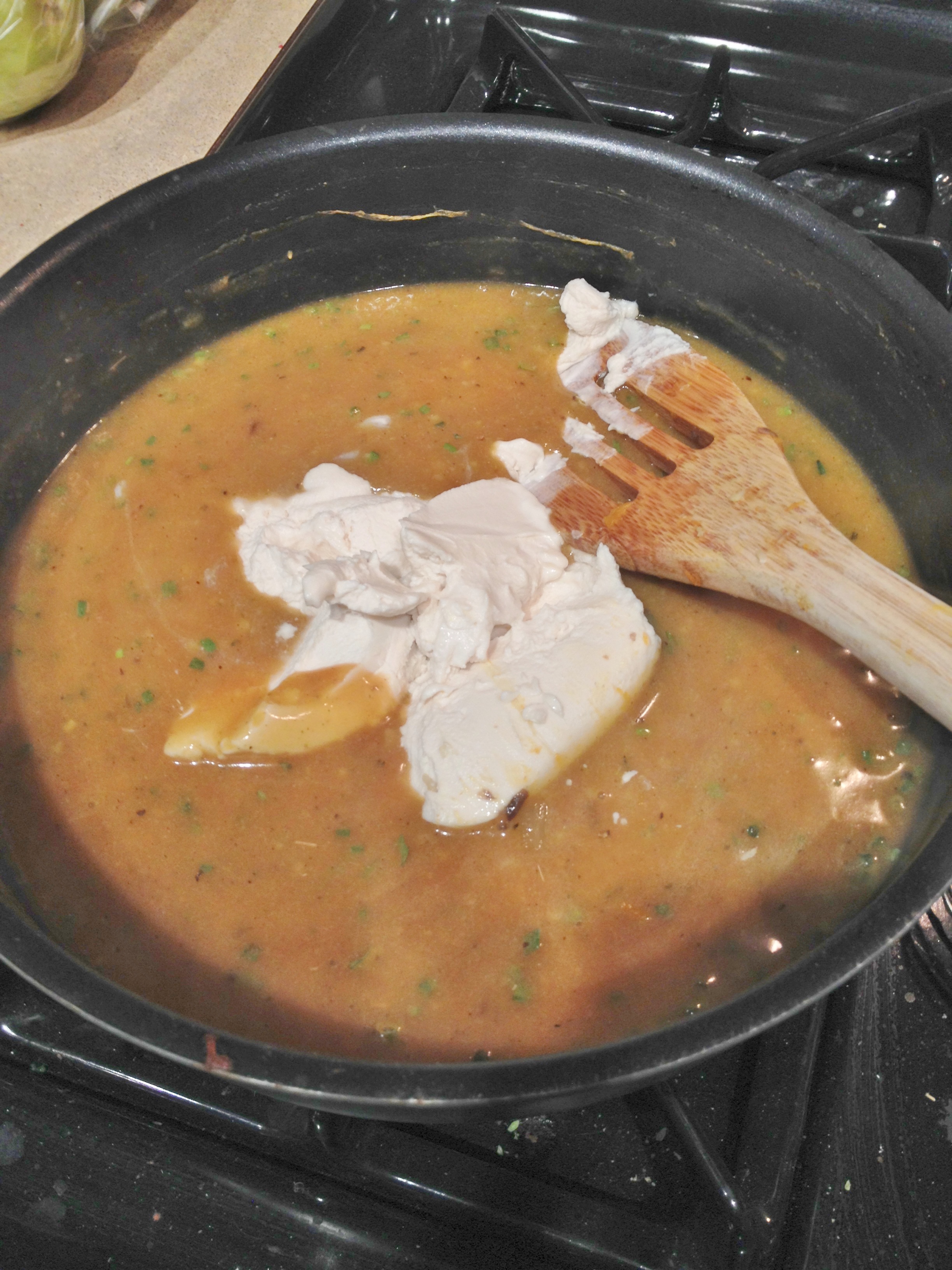 7. In pan melt butter then add flour and whisk then add 2 cups veg broth and whisk adding more if too thick. Add spices, Worcestershire, vinegar, and tamari and whisk. Add cream cheese and gently whisk in.