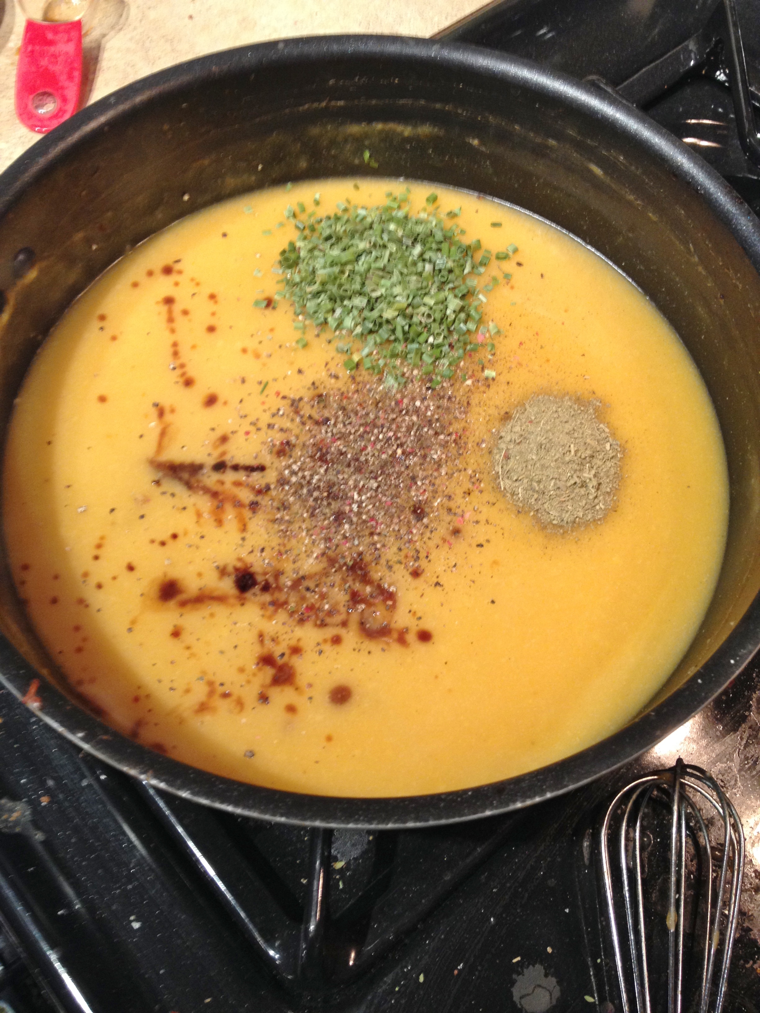 3. Slice off skin of butternut squash and scoop out innards. Chop into chunks and add to veggie pan. Put lid on pan, adding more broth if needed.