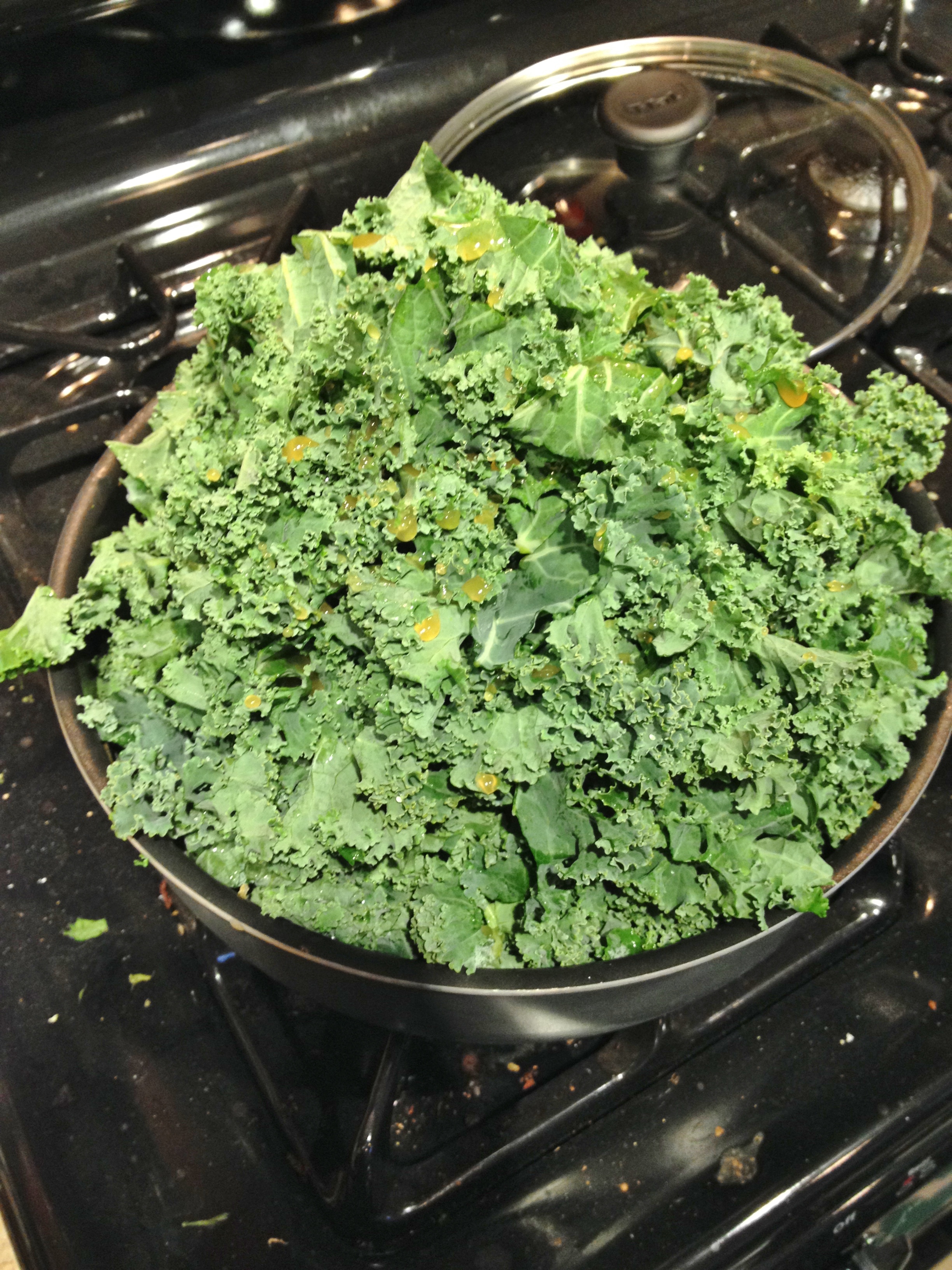 4. Wash and chop kale. Pour veggies into a baking dish then add kale to the pan with veg broth and put lid on to steam kale until just wilted. Be sure to mix so it doesn’t burn.
