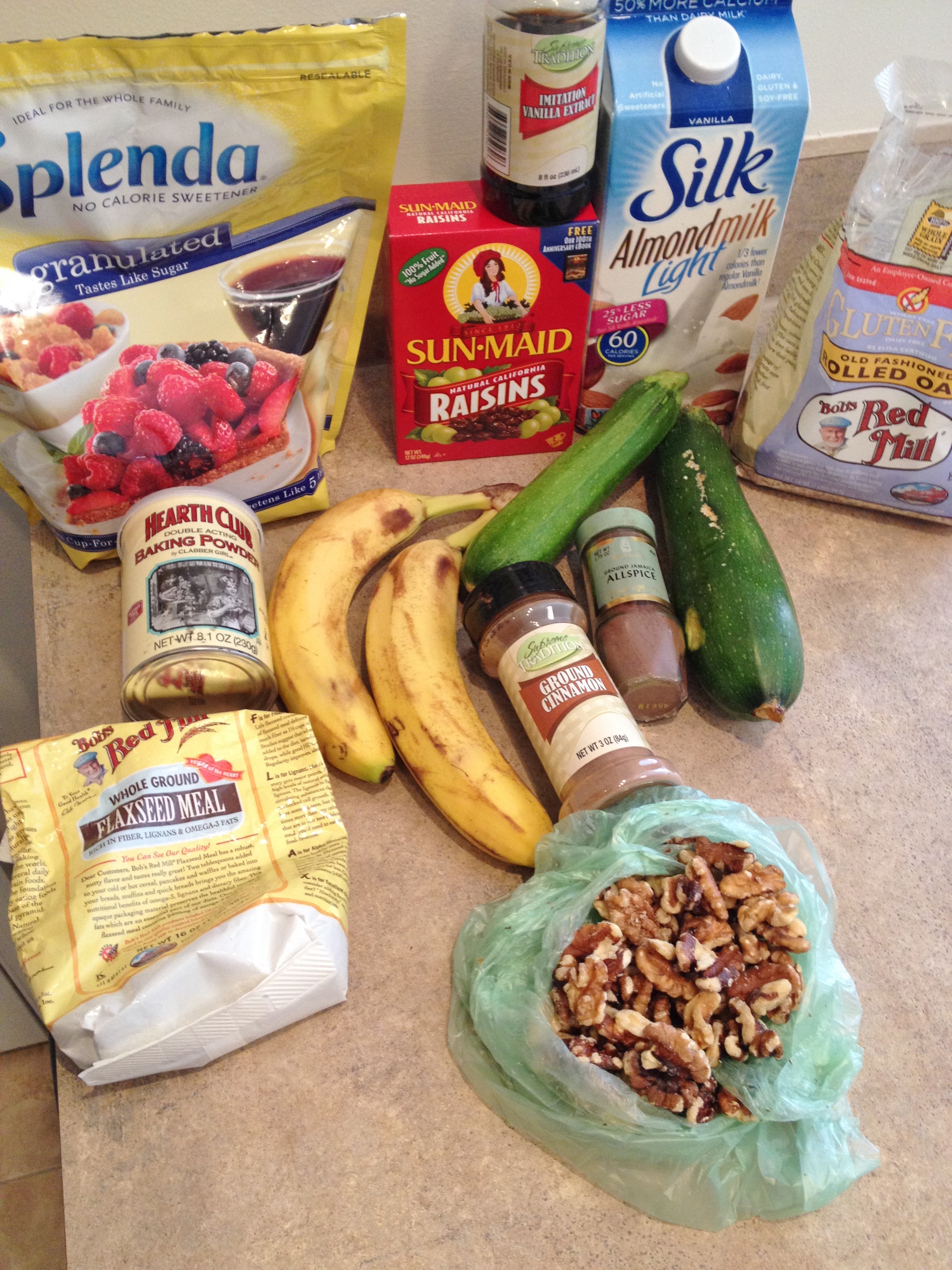 Start by mixing the oats, baking powder, and flax together. In a separate bowl mix the banana and vanilla then add the Splenda and mix. Add the cinnamon and allspice and mix then add to oatmeal and mix again adding all the milk. In food processor or using a hand-held grater, grate zucchini; add grated zucchini to mixture and mix well. Add in chopped walnuts and raisins and mix. Spray a baking sheet with non-stick spray then pour in oatmeal mix and spread out evenly. Bake at 350 for 60 minutes. Let cool then cut and enjoy!