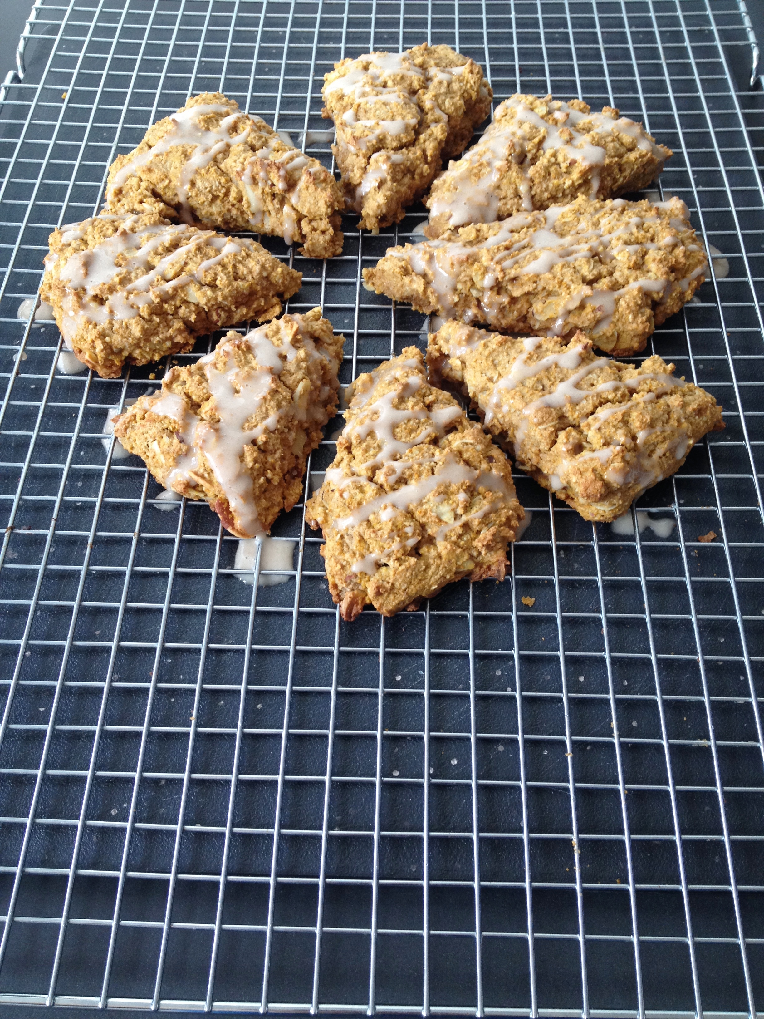Pour flours, baking powder, spices and sugar into a large bowl and combine. Slice in the butter (wash hands first) then use hands to squish butter into the flour mixture. Dump in pumpkin, extract, milk, and almonds and mix with a spoon – the flours are looser so you don’t have to use your hands with all this. Dump mixture onto a non-stick sprayed baking sheet. Form into a round then use a butter knife to cut into 8ths. Use a spatula and the knife to carefully separate dough. Bake for 15 minutes at 425 degrees. Take out and place on drying rack to cool. Once cooled make icing – dump everything into a small cup and mix with a fork. Use the fork to drizzle over all scones. Enjoy!