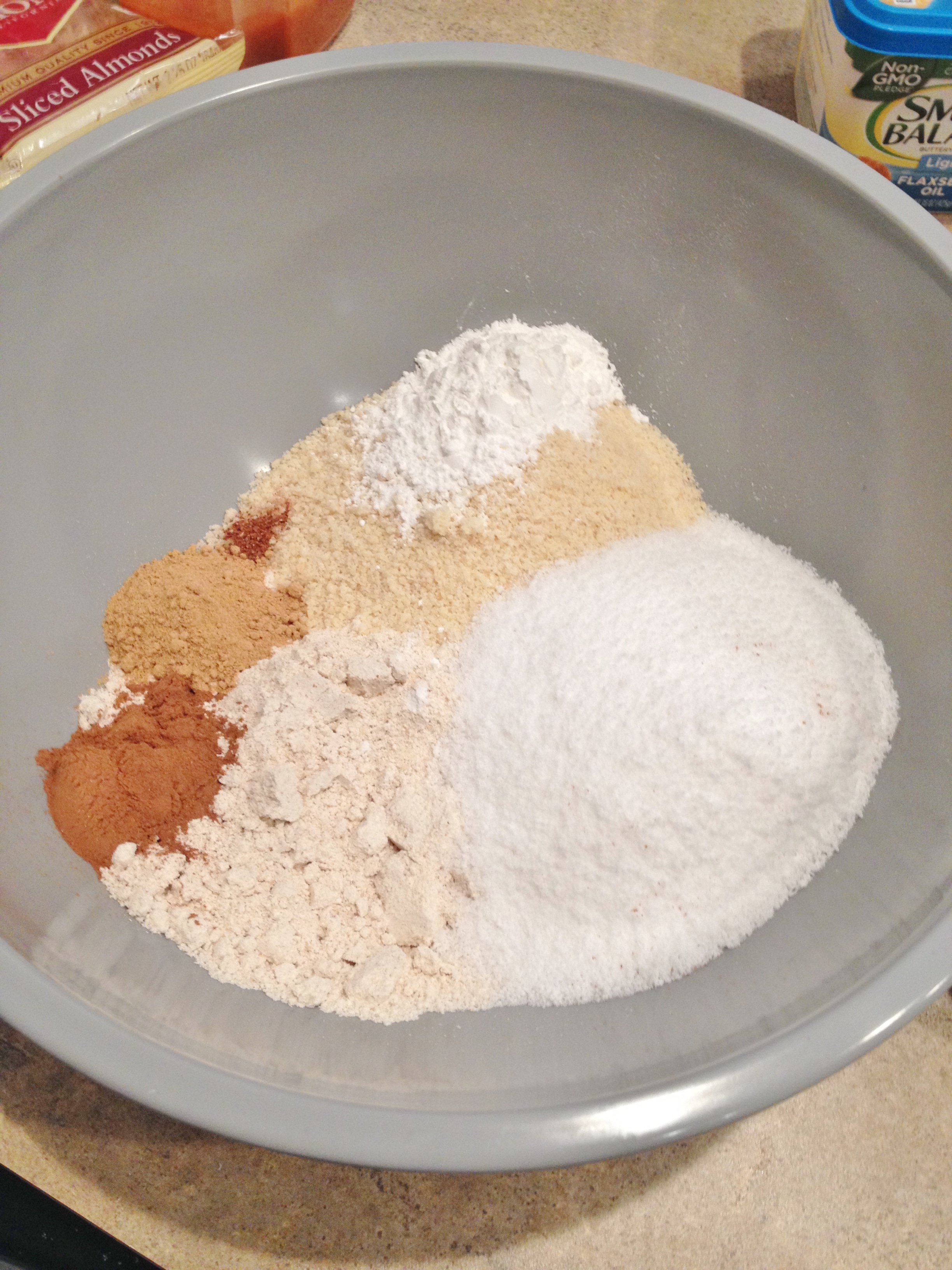 3. In large bowl add flour, baking powder, spices and sugar. Combine well.