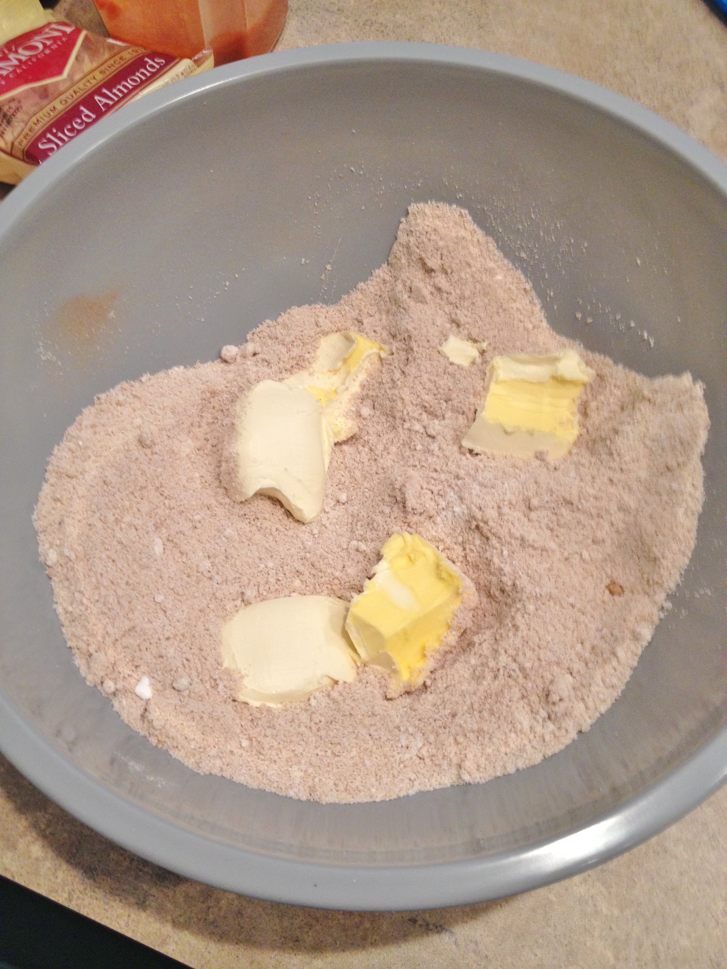 4. Slice butter into small pieces and drop into bowl. Using hands, squish butter into mixture until all butter is combined.