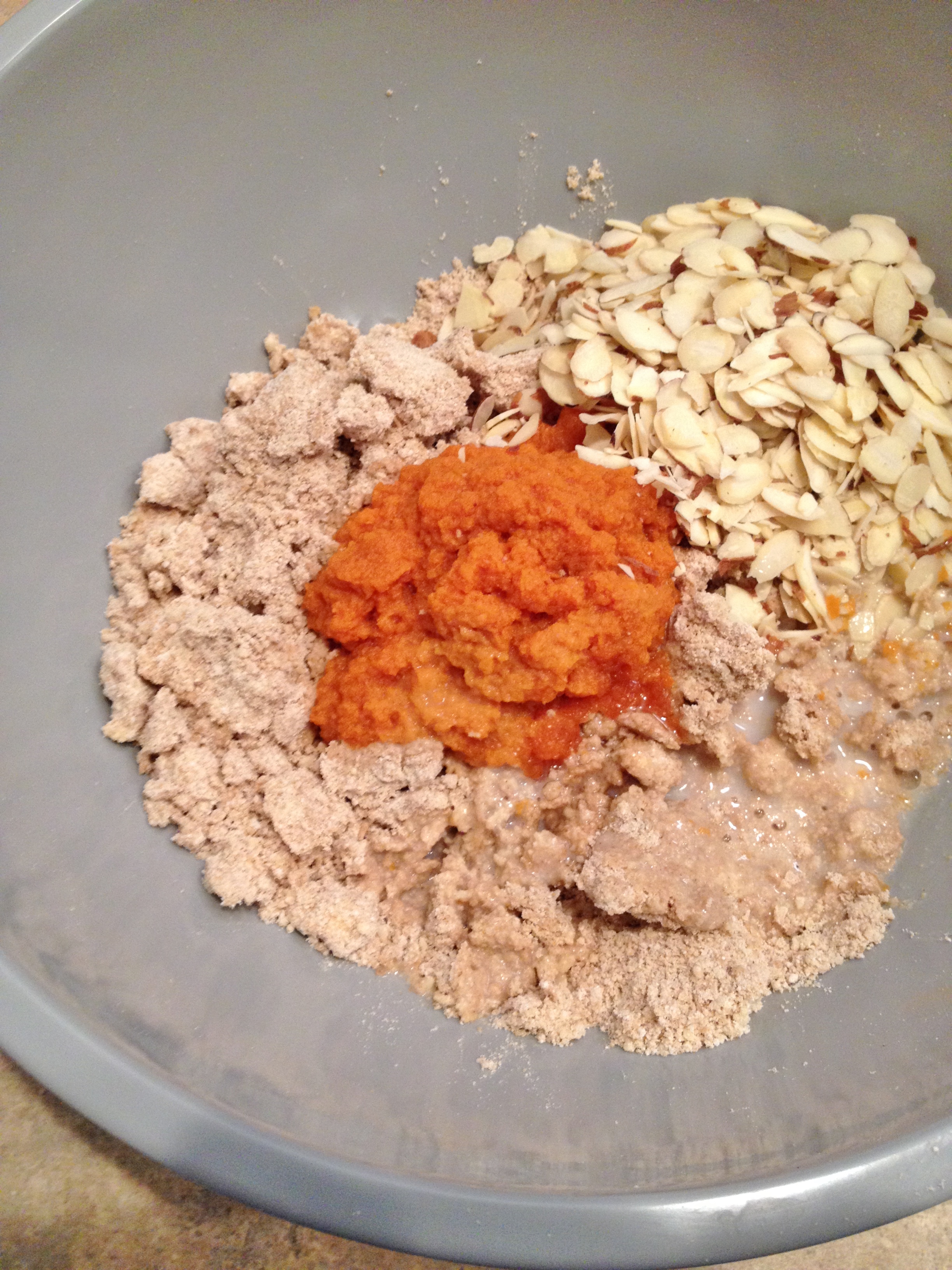 5. Add pumpkin, almond milk, extract, and almonds. Mix well with a spoon.