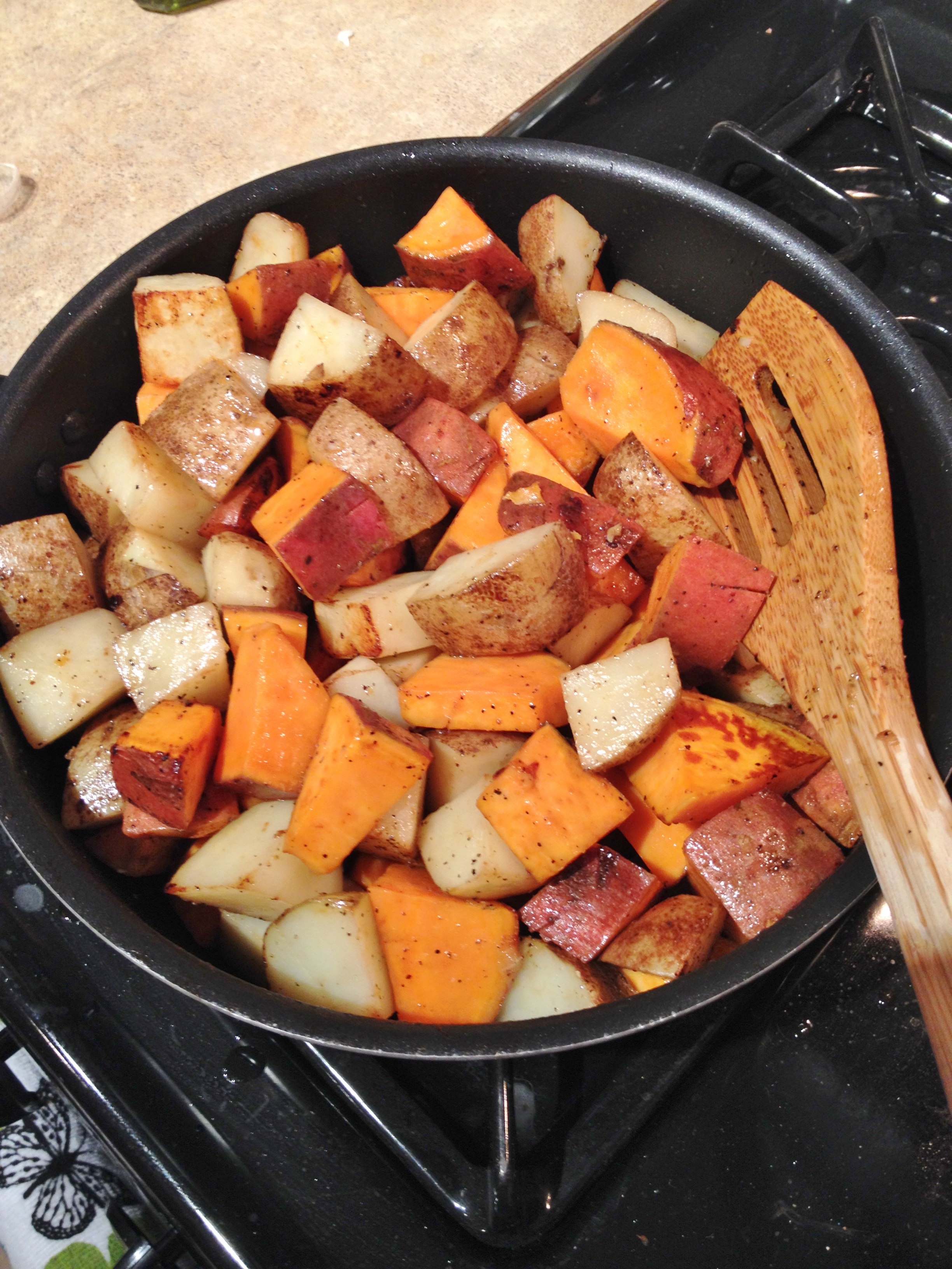 5. Once potatoes are soft, take out and when cool enough to handle chop into small-mediumish like-size chunks.