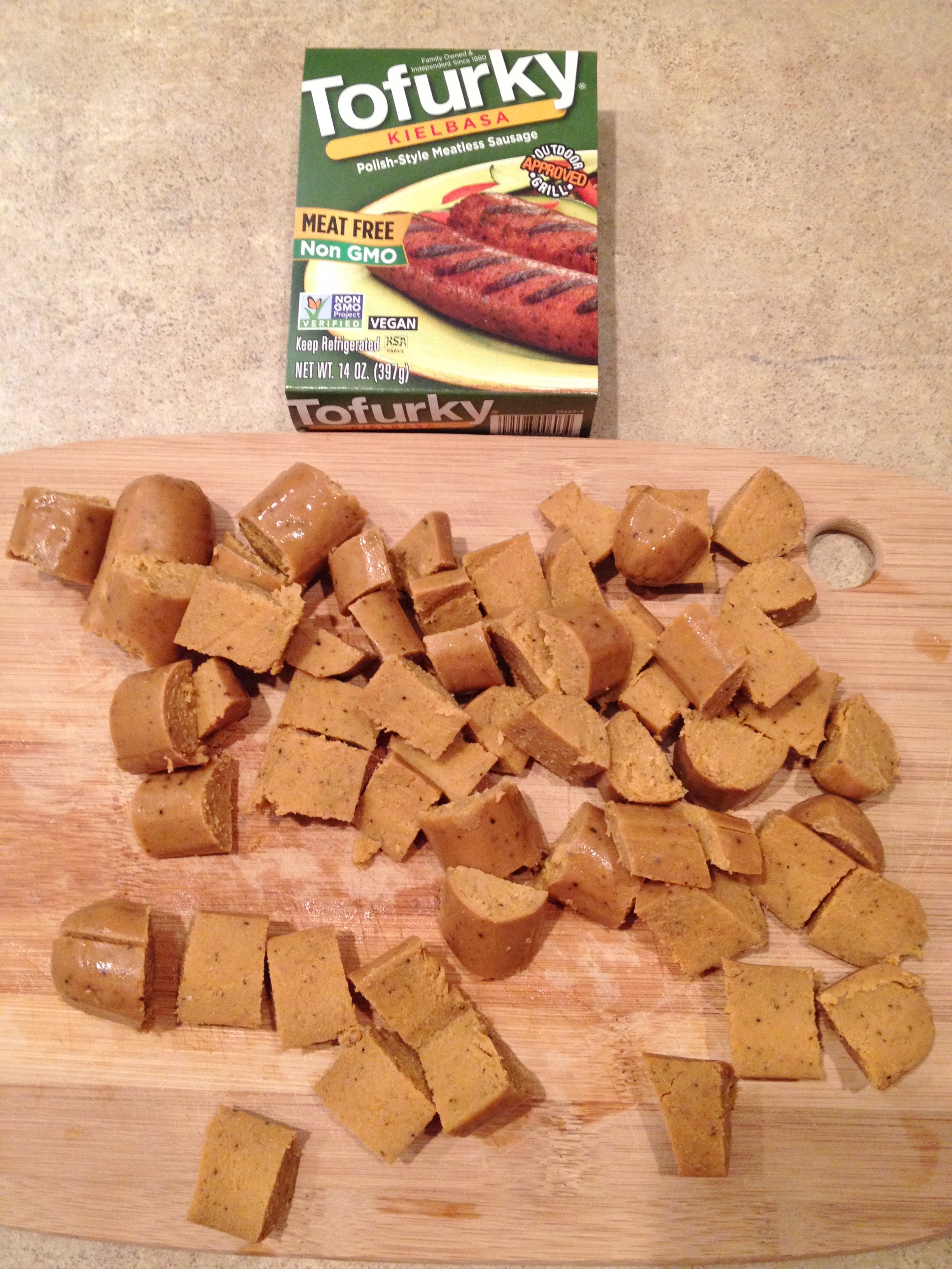 When my mom would make this when we lived back in Oregon she would make it with Oktoberfest Sausage and we would all eat it, but my picky-eater brother would eat around the onions and peppers, so all my memories of this dish are meaty with tons of leftover veggies. Well now when my mom makes it, she doesn’t make it with Oktoberfest Sausage anymore (they don’t make/sell it in Texas) which works for me for obvious reasons, but works for my SIL too since most sausage isn’t gluten-free (seems a little weird). But I have to say when I eat it I do miss the meaty texture of that sausage and spices that were in it, so I decided to make my moms breakfast hash with some Tofurky Kielbasa sausage. And I don’t know about you but everytime I pop open that sausage I barely get the chance to get it in the dish cause I just start snacking on it, it’s so good!