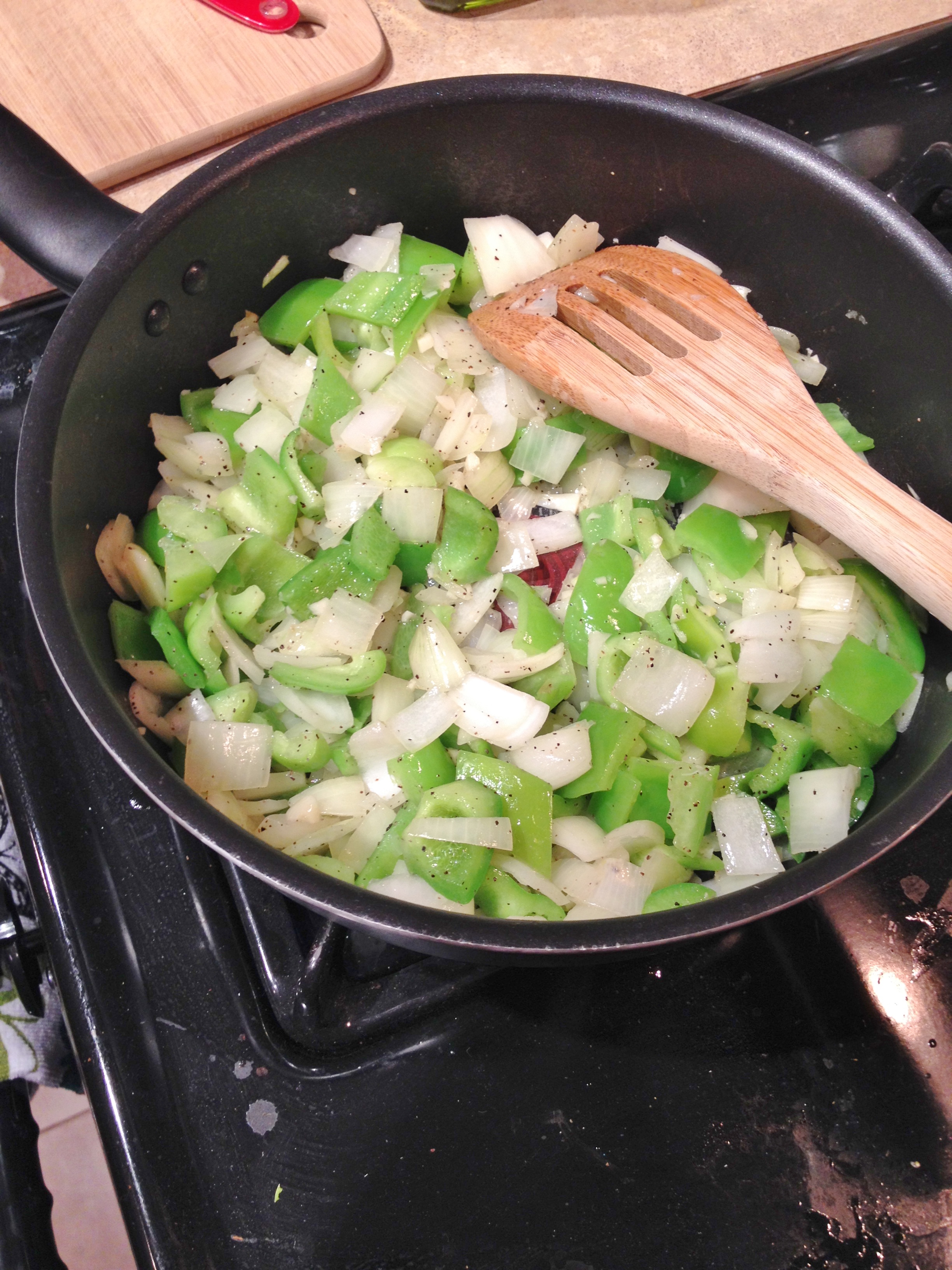 3. Add a little oil to a saute pan and add veggies, garlic, and one teaspoon black pepper.