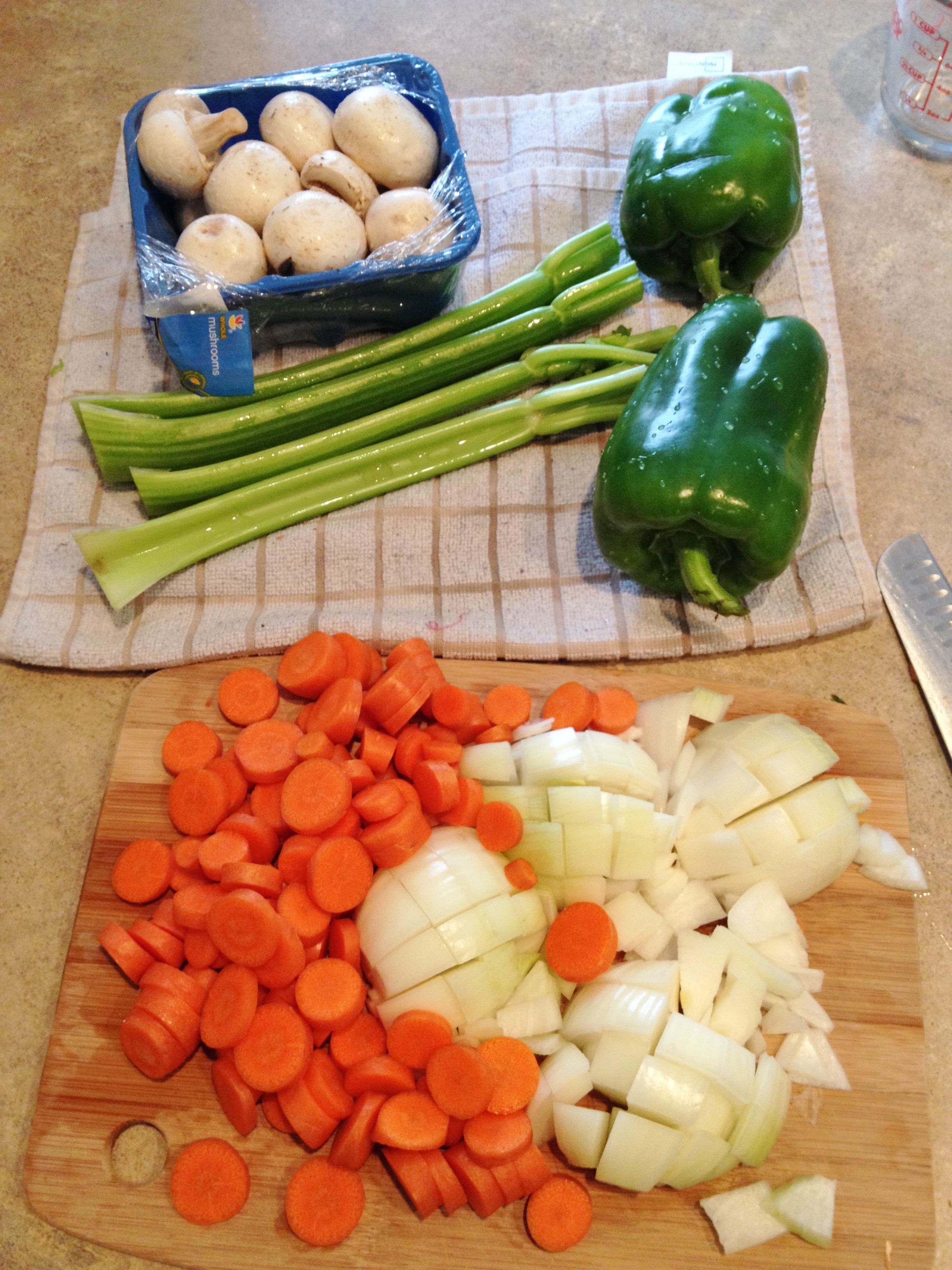 3. About 45 minutes in start chopping veggies. Drop all veggies into the pot and pour in more broth – enough to cover.