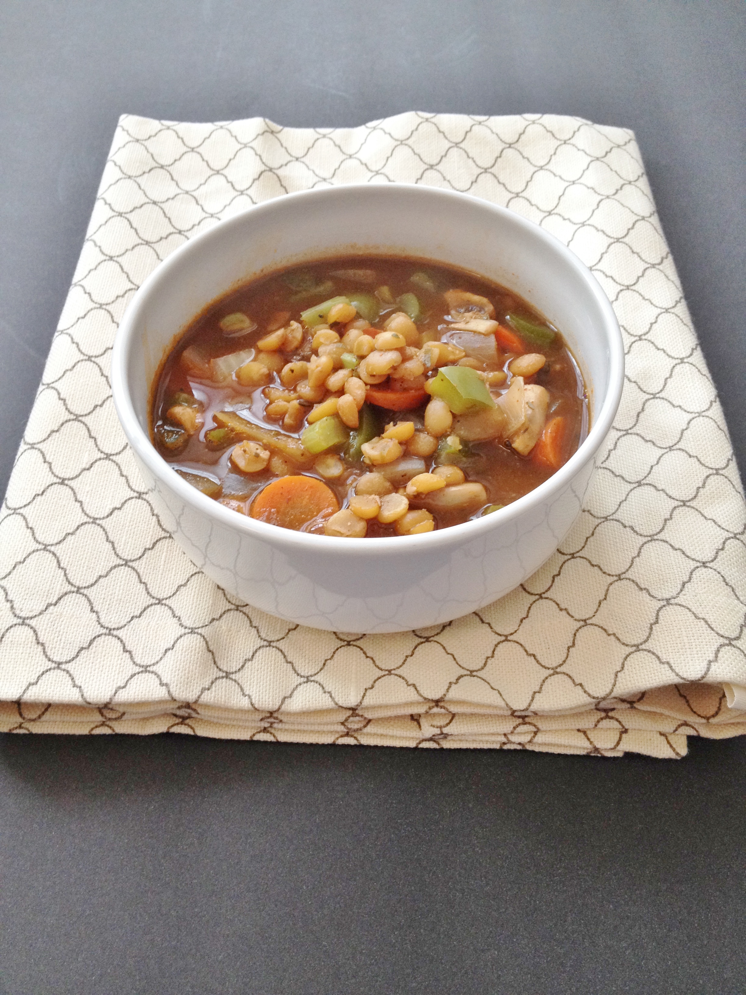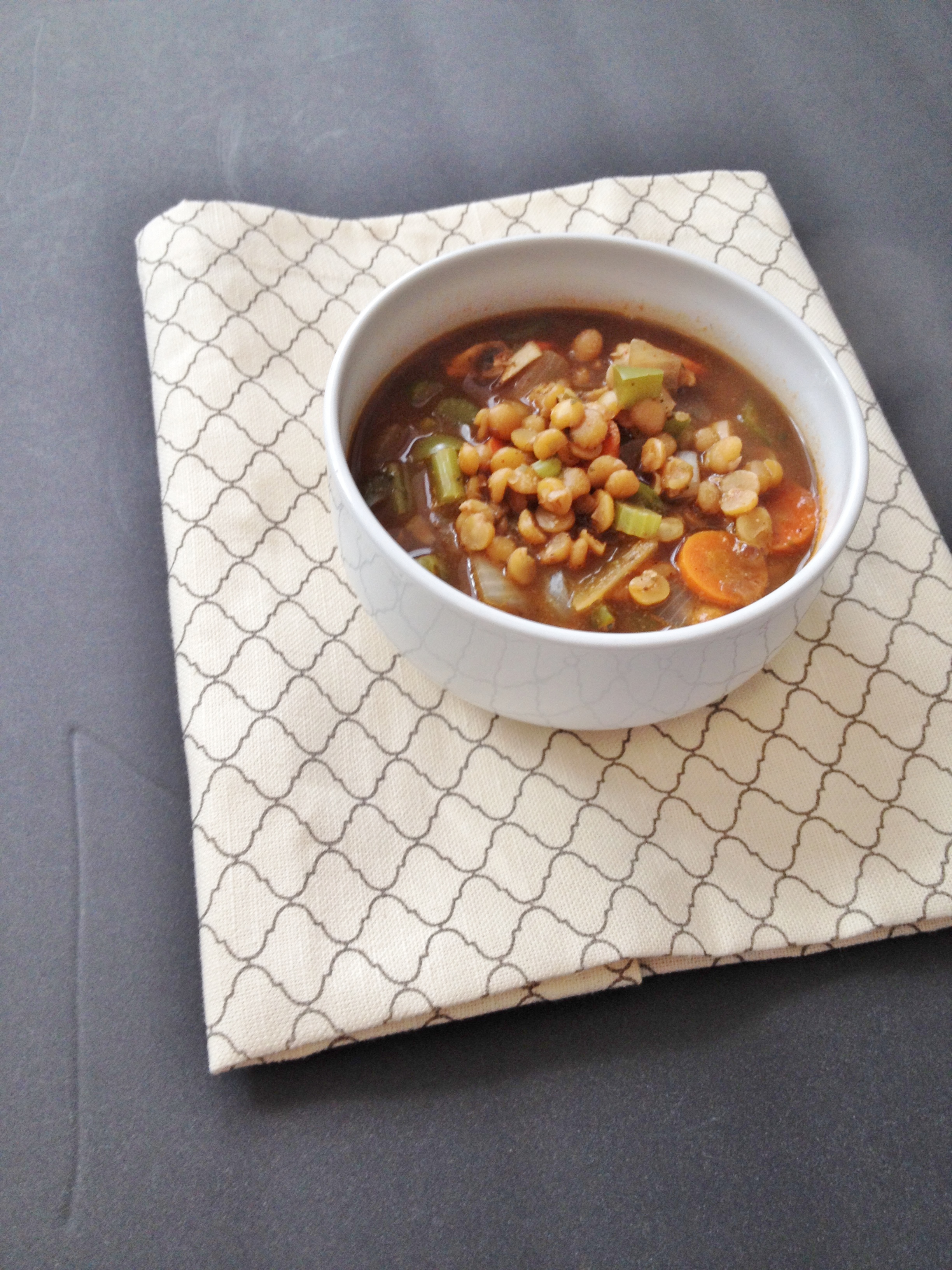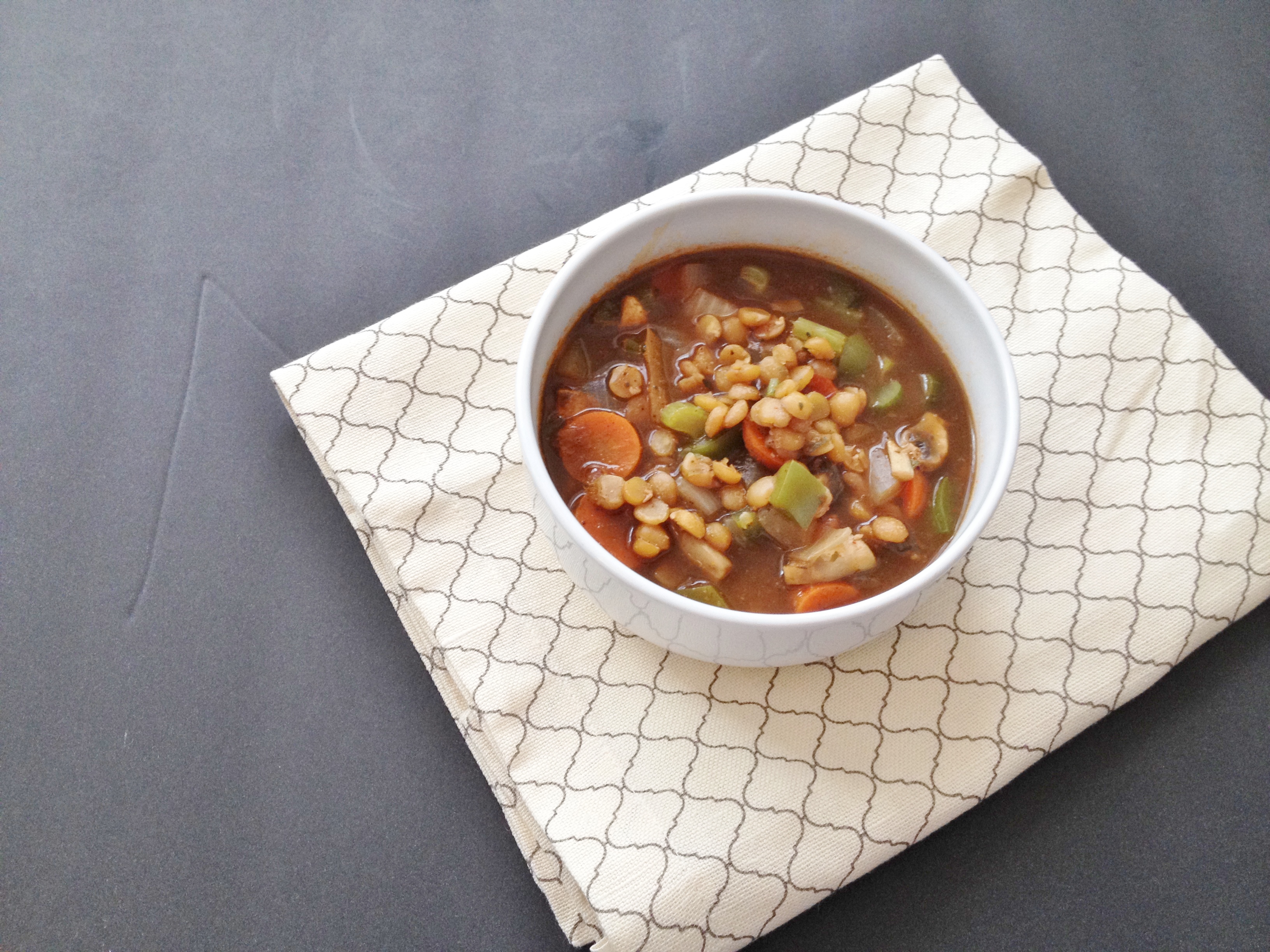 Start by rinsing off your dried lentils in a strainer and picking through with your fingertips to see if anything non-lentil is there and take out if you find anything. Dump rinsed lentils, one container of broth, and all spices into a large pot. Bring to a rolling boil, then turn heat back to low-medium and put the lid on skewed and let cook about an hour, stirring periodically. About 45 minutes in start chopping all veggies. Dump all veggies into the pot and pour in more broth; let cook another 30-45 minutes, stirring periodically and adding broth as needed – you want the veggies to be just soft and the lentils to still have a bite to them. You may have left over broth at the end depending on how liquidy you want your soup, or depending on how big your pot is – my pot isn’t big or else I would have use both containers, I had about 1-2 cups leftover.