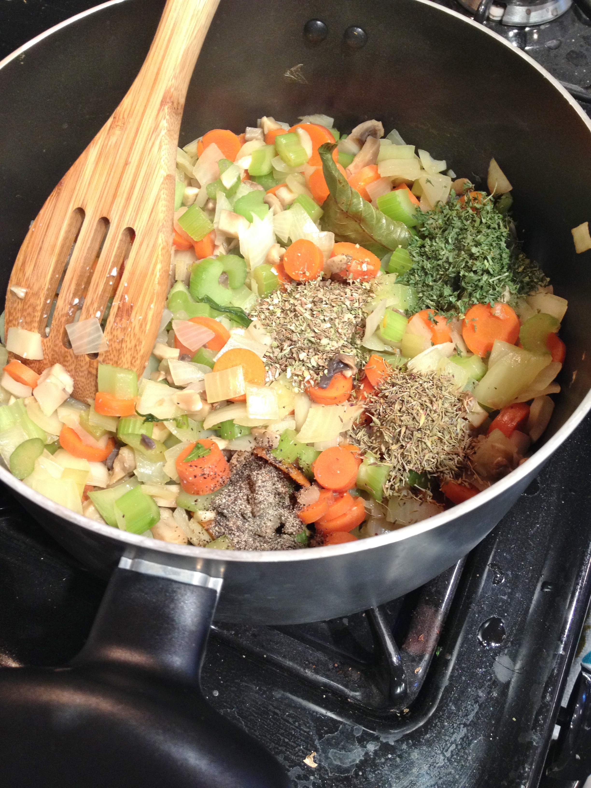 4. Add about 1/4 cup vegetable broth and bay leaf to veggies and cook on medium heat, stirring occasionally so nothing burns, until liquid is gone.