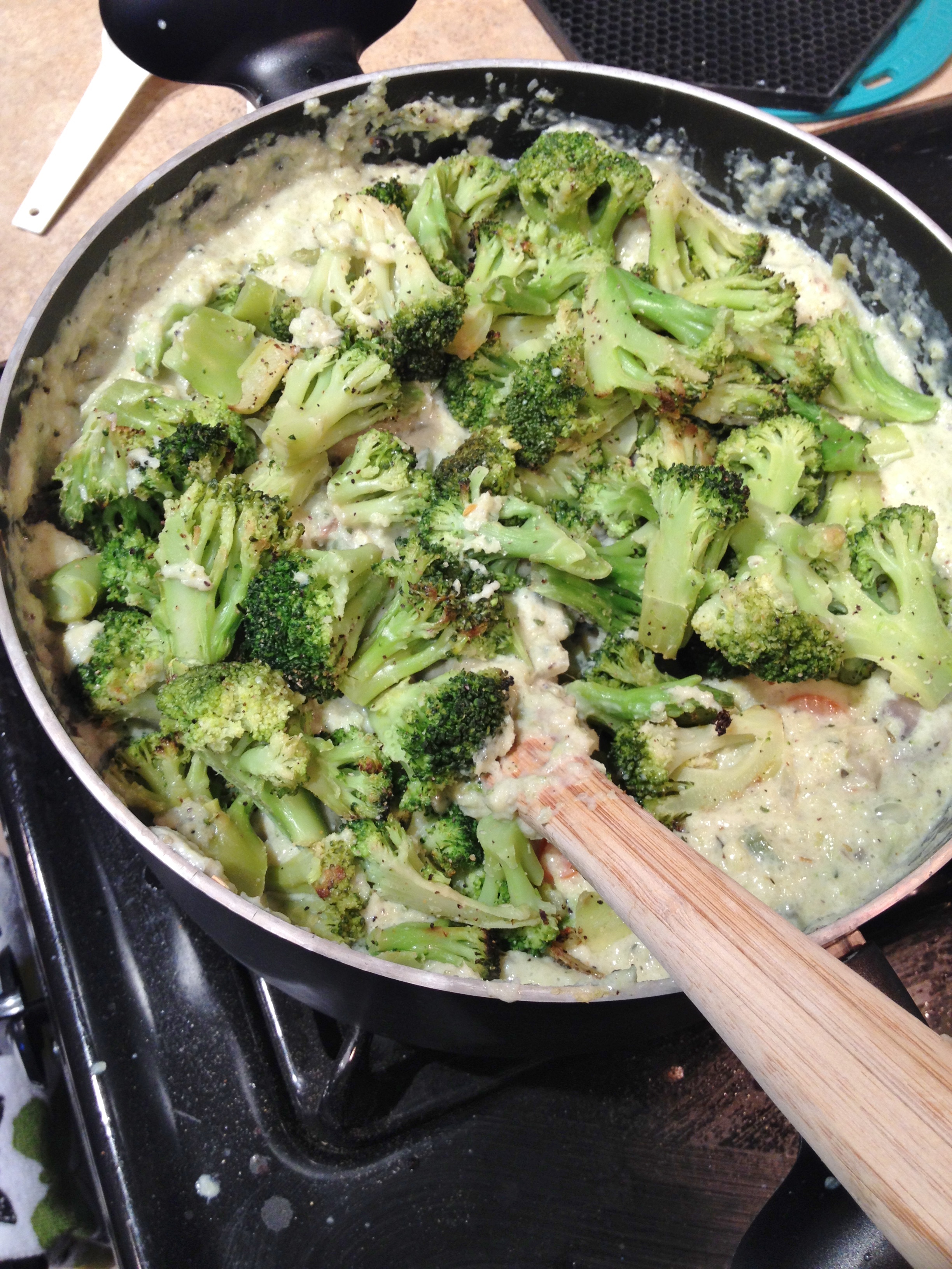 Which this did; it is seasoned great and with no cheese or flour it is guilt free, and full of protein with the silken tofu – and no, you can’t taste the tofu for all the tofu-haters out there. I did have a slight fail with this though, which is why the pic below has flour in it; I had meant this to be a broccoli and dumplings soup – but dumplings? They are not all that tasty – or at least mine weren’t, so no flour laden balls of dough here. I will work on that though; it won’t beat me!