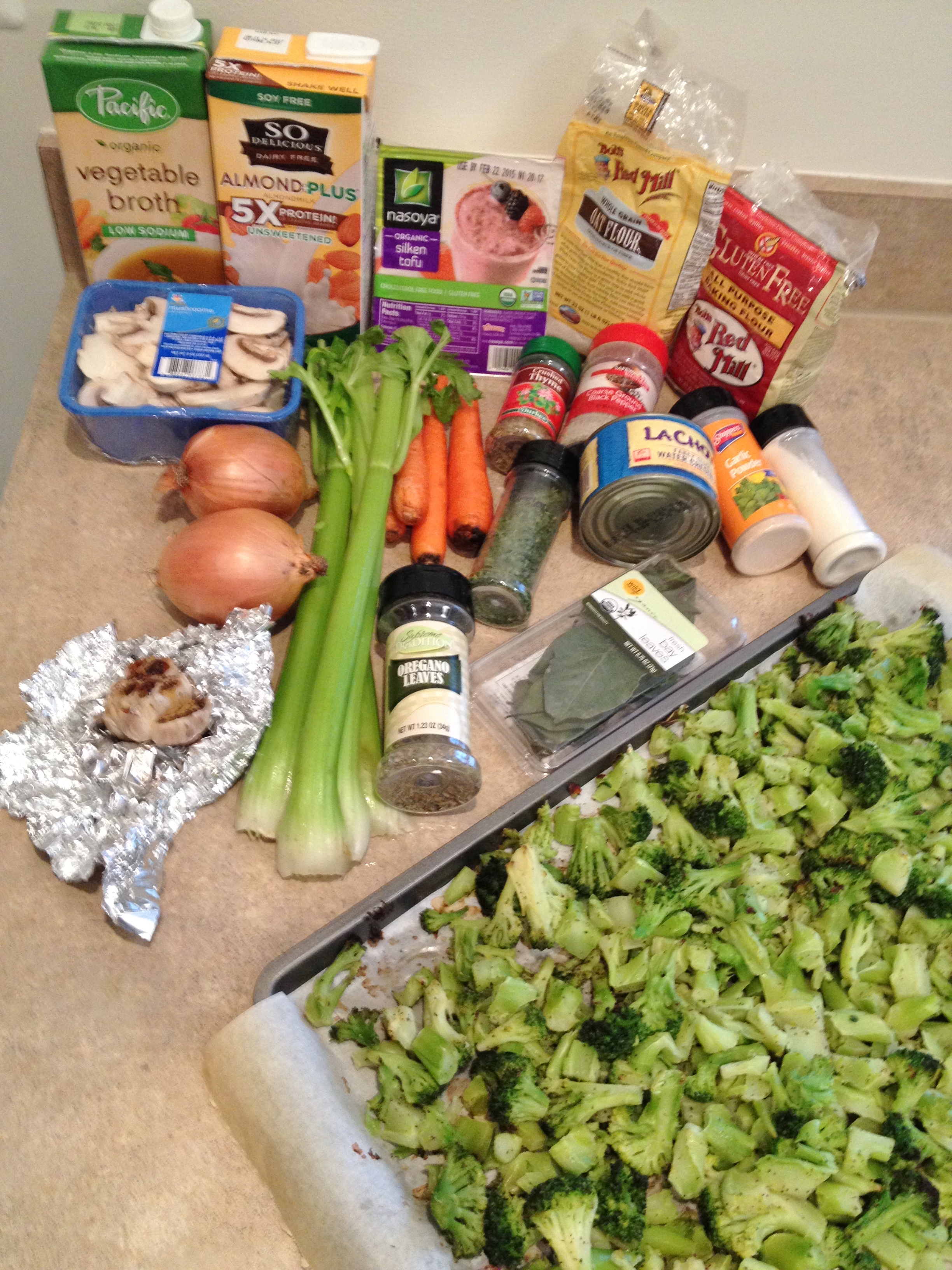 I bought a big ole bag of frozen broccoli pieces because it was cheaper than buying fresh, and easier than cutting up all those broccoli florets and stems. Defrost the bag of broccoli overnight; set oven to 375 degrees and line a baking sheet with parchment paper. Spread broccoli over parchment paper then sprinkle with olive oil, black pepper, garlic powder, and onion powder then mix with fingers and spread out evenly. Cut top off a bulb of garlic then place in the center of a piece of foil; sprinkle with olive oil and black pepper then fold the foil up over the garlic. Bake for 20 minutes then take out the broccoli and mix, then spread back out and put back in the oven for 25 more minutes. Let cool until you can touch both the garlic and broccoli without burning fingertips off. Once the broc and garlic are out of the oven, chop onions, celery, carrots, and mushrooms and dump into a large soup pot with a little oil. Turn burner to medium and let saute and add about 1/4 cup vegetable broth and bay leaf. Let cook until liquid is gone then add all herbs and mix again to wake up dried herbs. Pick through the broccoli and set florets to the side of the pan to add to soup and the pieces will get blended. To the blender add one cup milk, half the tofu, and half the broccoli pieces and blend; it will be thick and that is what you want. Pour into pot and mix. Add rest of milk, tofu and broc pieces to blender and blend again – it should be runny and that is perfect. Add to pot with 1 1/2 cups vegetable broth and mix. Add leftover broccoli and mix. Put lid on pot and let cook 30-45 minutes, adding rest of broth throughout cooking to loosen up soup. About ten minutes before ready to eat add the water chestnuts. Enjoy!