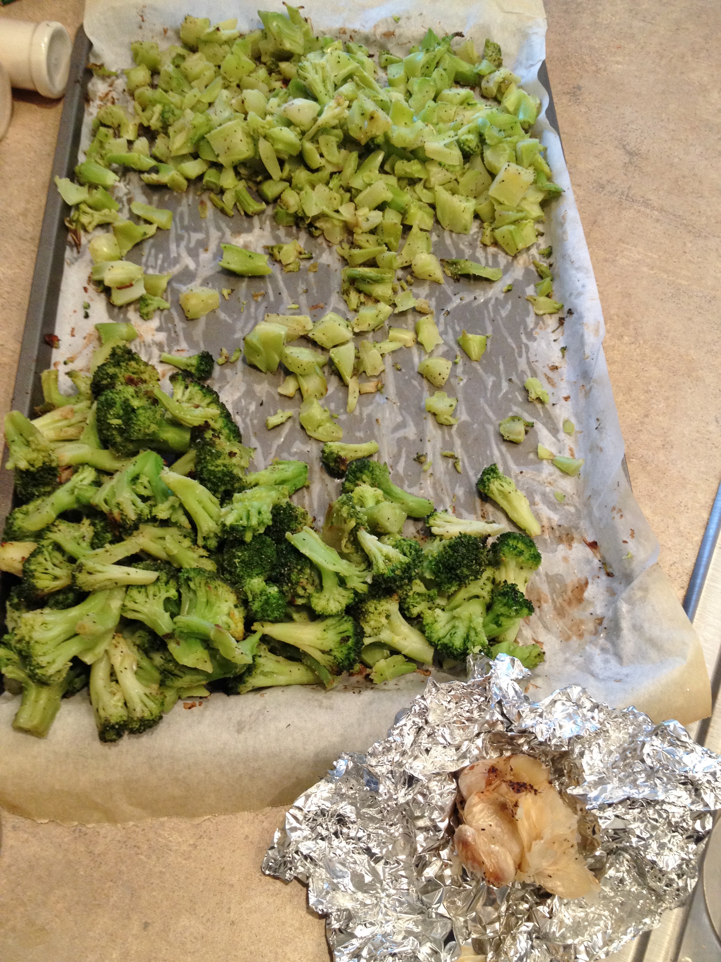 2. Set oven to 375 degrees; spread broccoli over parchment covered baking sheet and sprinkle olive oil, black pepper, garlic and onion powder over veggies and mix with fingers then spread out. Cut top off garlic and place in some foil and sprinkle with olive oil and black pepper and close foil around garlic. Bake 20 minutes then take out broccoli and mix and spread back out then bake 25 more minutes. Take out and let cool enough to handle.