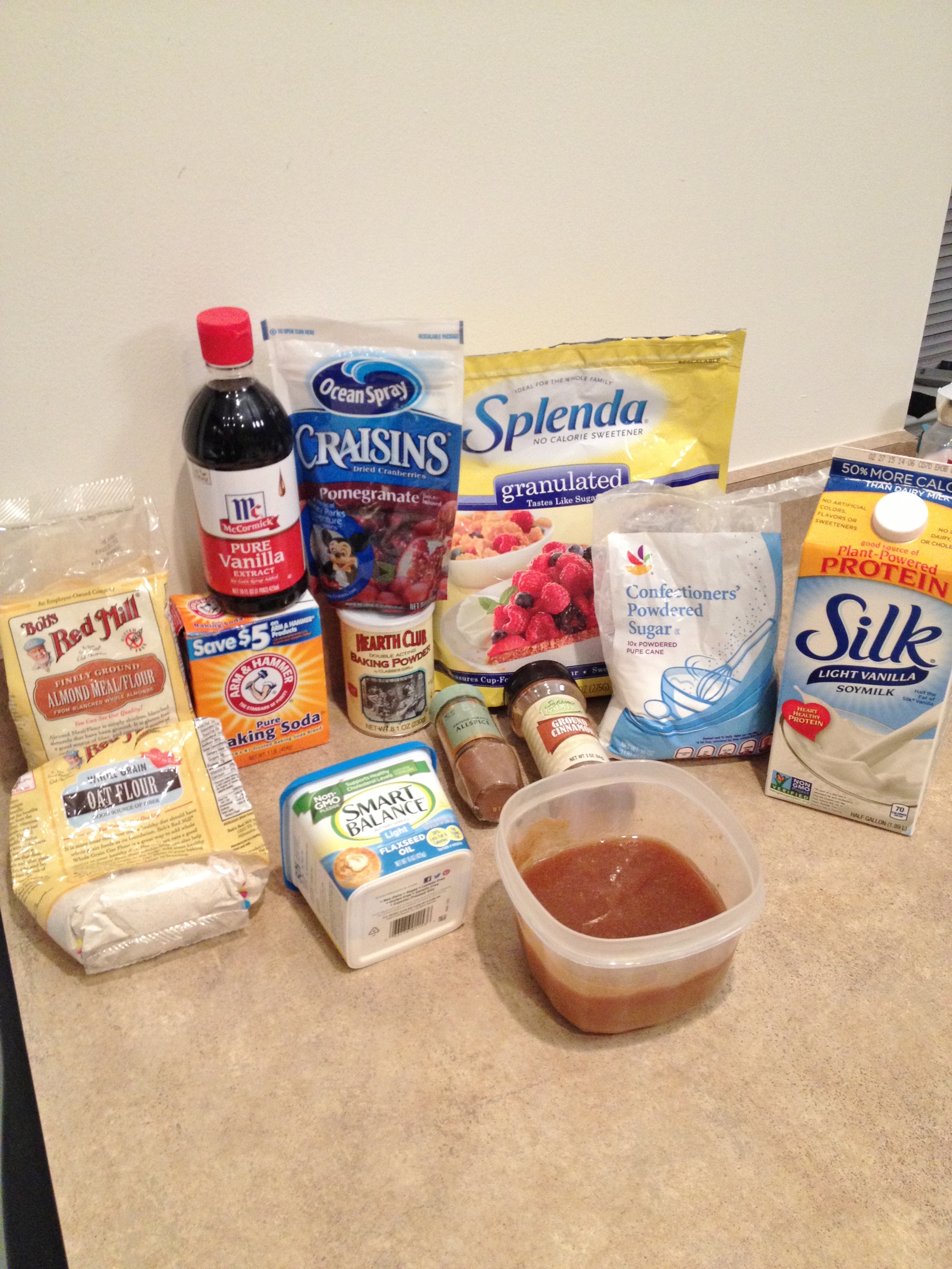Mix flours, baking powder and soda, and spices in a large bowl. Add butter and two tablespoons pearsauce and mix with clean hands. Add Splenda, rest of pearsauce and vanilla extract and mix with a spoon. Add craisins and mix again. Line baking sheet with parchment paper then pour batter onto sheet. Using the spoon, spread out into a long rectangle / log, not too wide. Bake at 375 degrees for 25 minutes. Take out and let cool completely. Once cooled slice rectangle into eight triangles. Mix icing ingredients in a small bowl then pour over cooled scones. Enjoy!