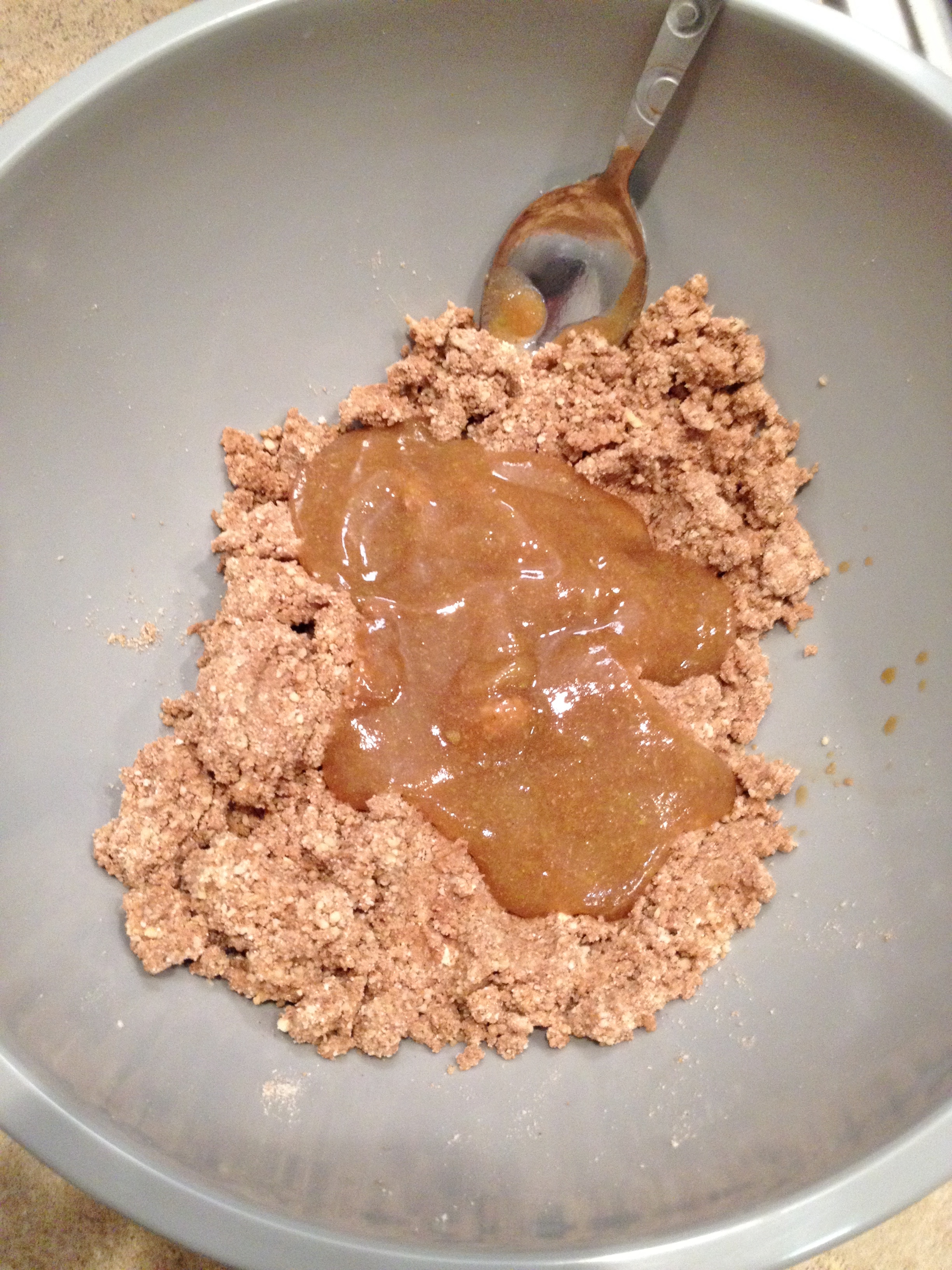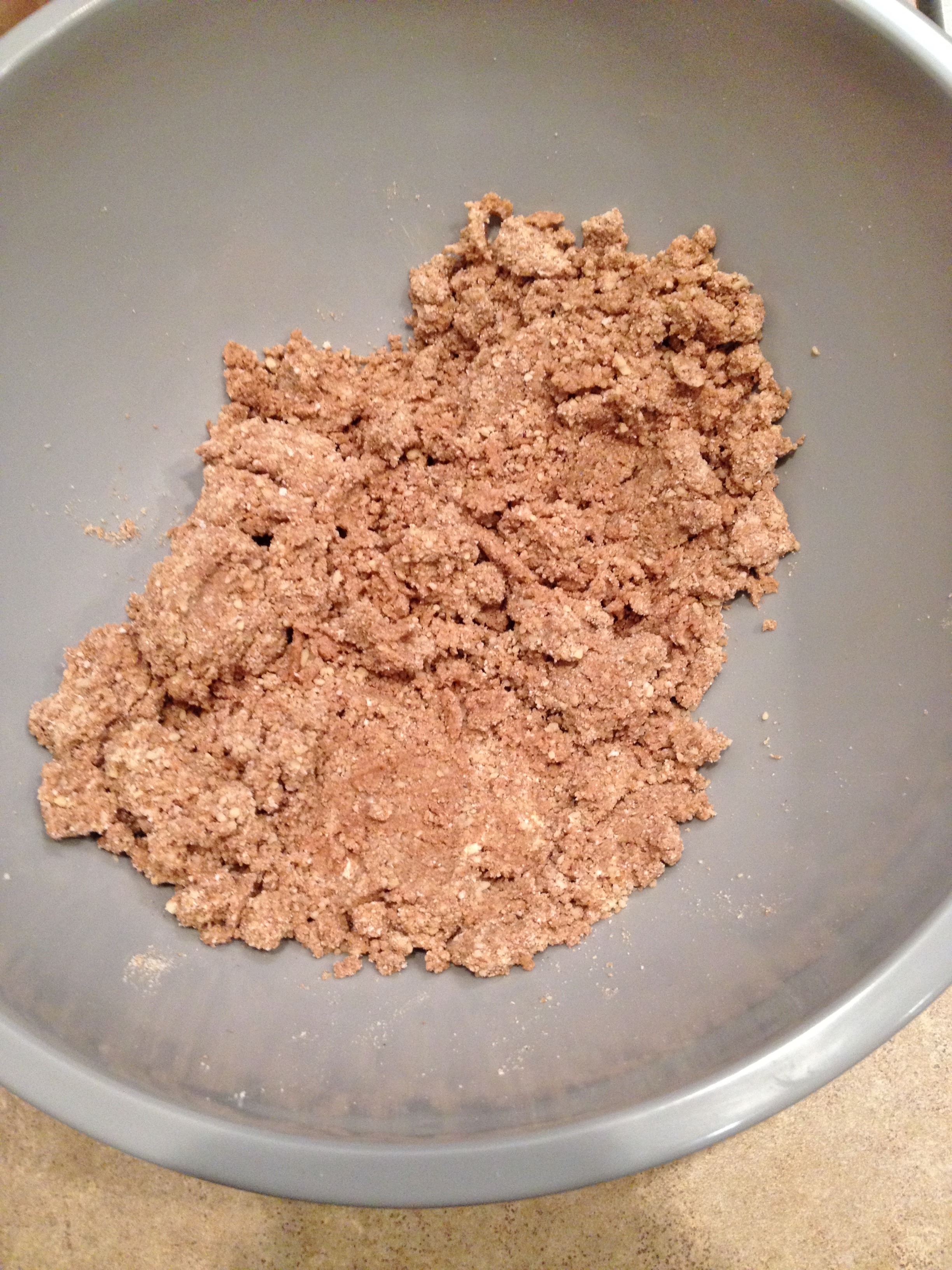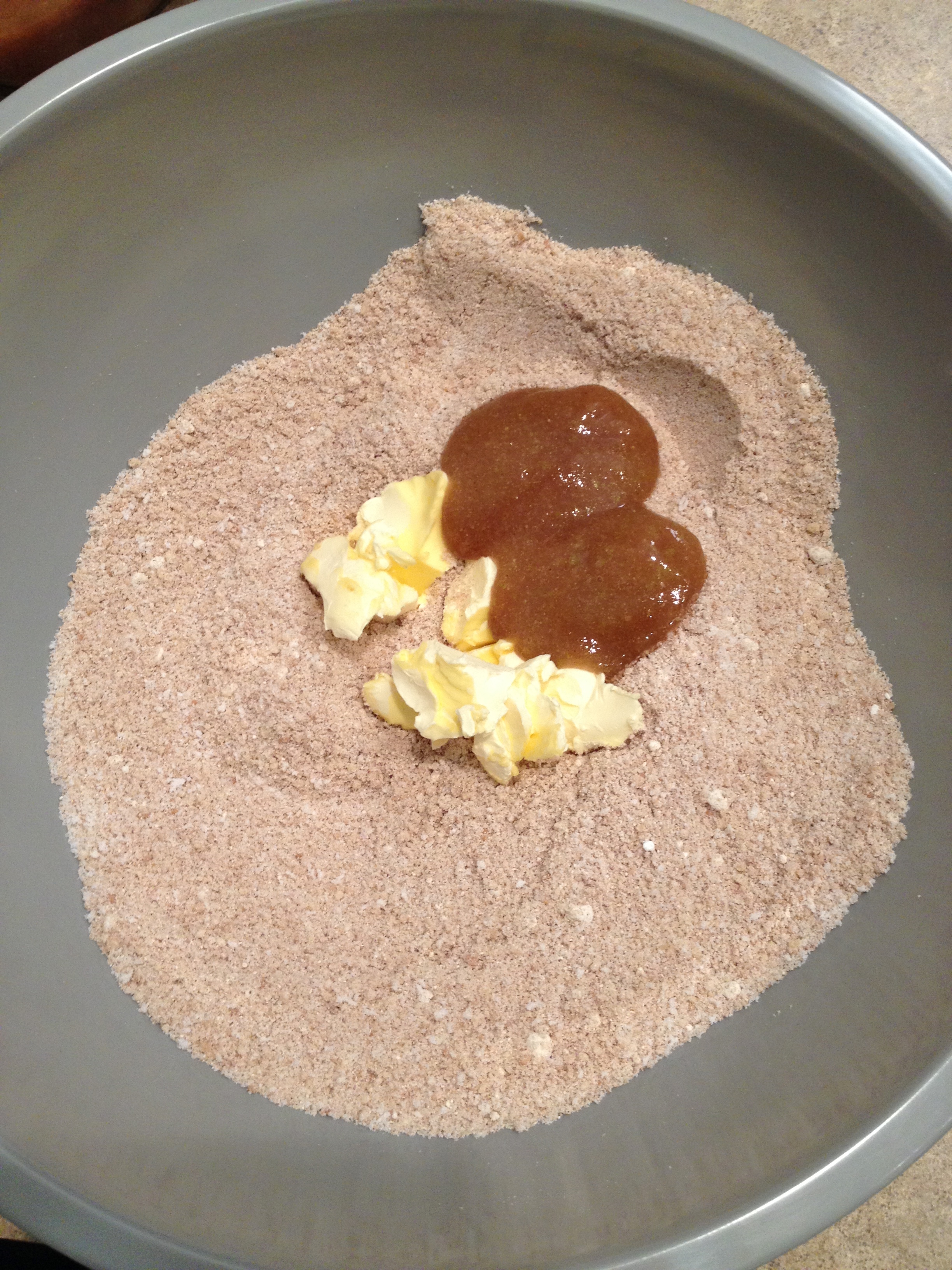2. Mix flours, baking powder and soda, and spices in a large bowl then add butter and 2 tablespoons pearsauce. Use hands to squish everything together.