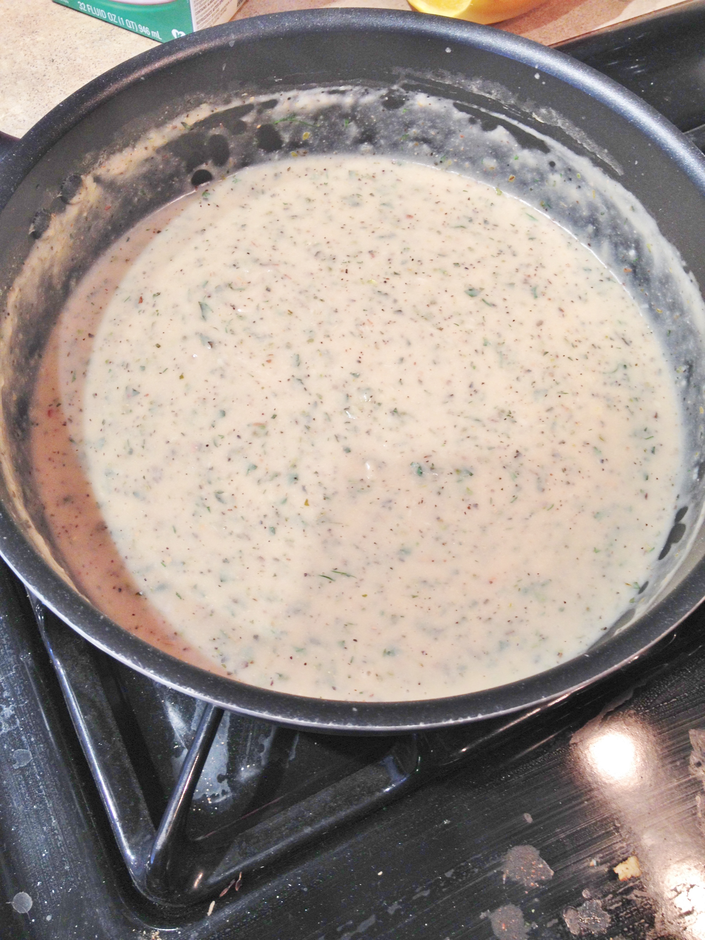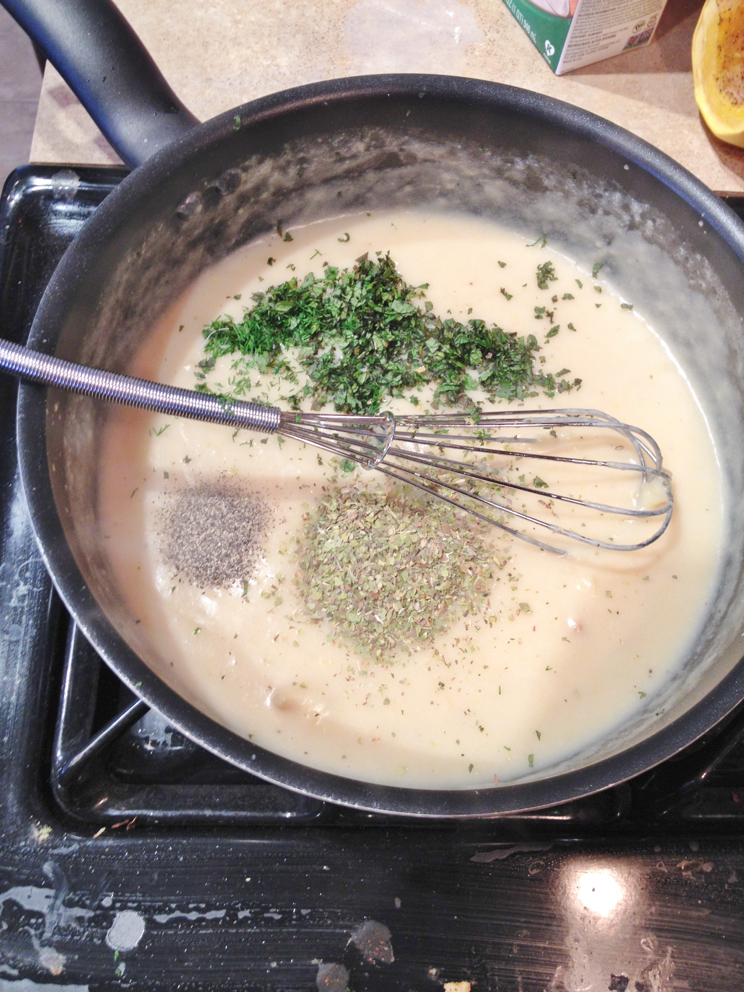 6. Add in chopped herbs, dried oregano and black pepper, and roasted garlic and whisk. Add one more cup of milk to loosen up.