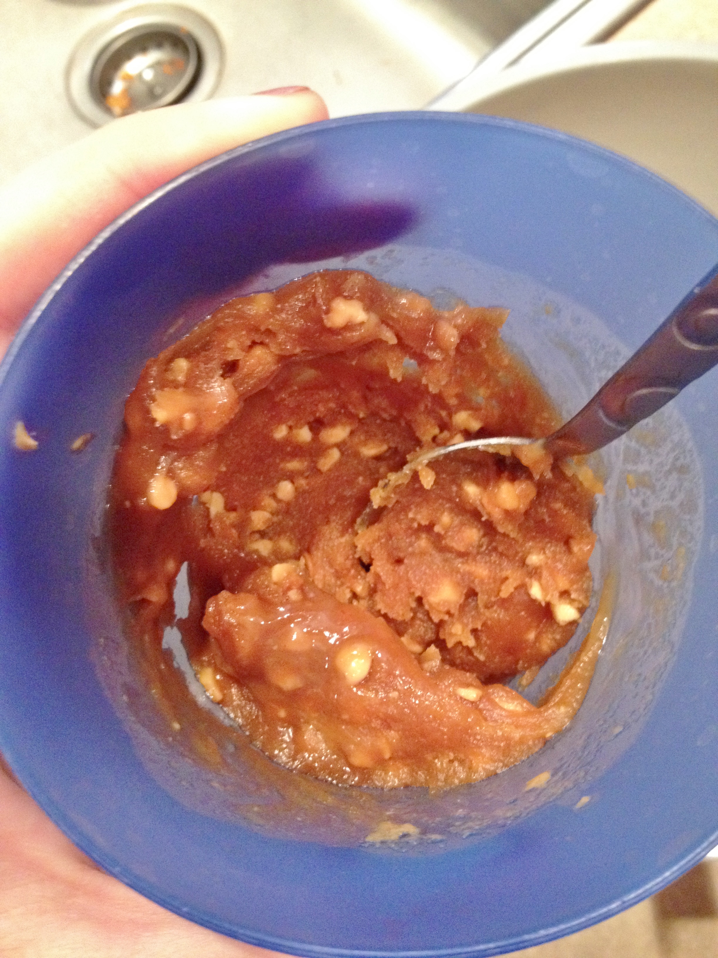 3. In a microwave safe cup heat peanut butter and stevia, between 15-30 seconds. Mix with a spoon.