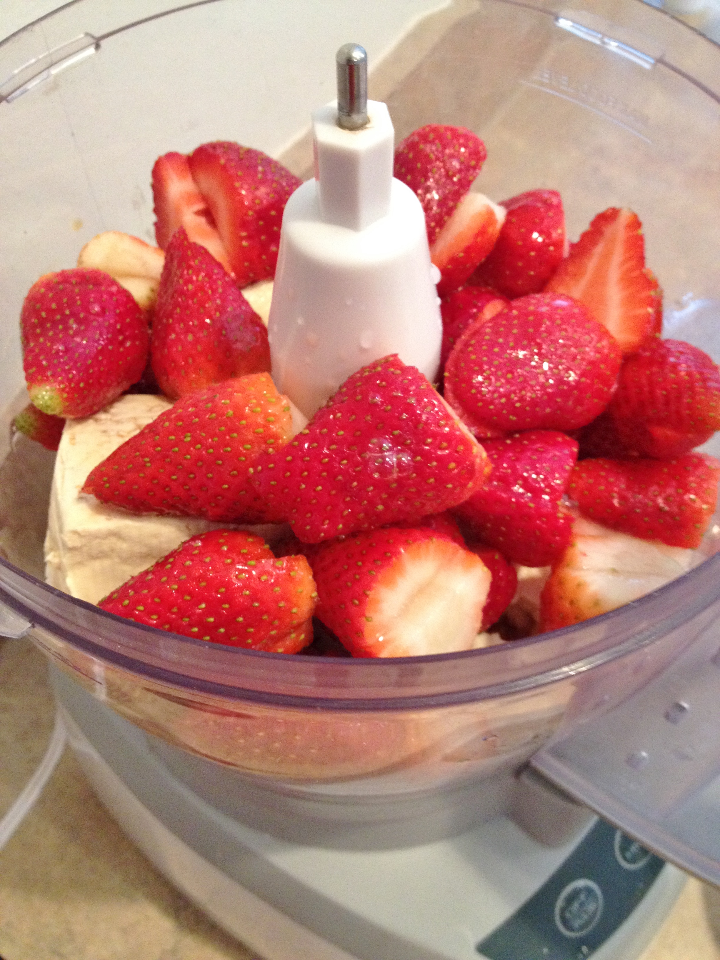 The peanut butter granola cups were super simple. Just mix the dry ingredients then heat the peanut butter and simple syrup in a cup in the microwave until runny then mix with dry. I used my hands but you can use a spoon; add water to help get everything sticking together. Press the granola into non-stick sprayed ramekins. Their isn’t a lot of granola so be sure to portion it first before pressing into ramekins. Press up the sides and into the bottom – it will stick to you and break, but do the best you can. Place ramekins on baking sheet and bake at 350 for 20 minutes. Once completely cooled process all mousse ingredients in food processor. Be sure to drain the tofu and press out as much liquid as you can with your hands, also wash the strawberries and cut off tops. Process for 1 minute then scrape down sides then turn back on for another 2 minutes. Pour into ramekins and pour leftovers into a cup. Put in fridge to set – I made mine in the morning so they would set by evening.