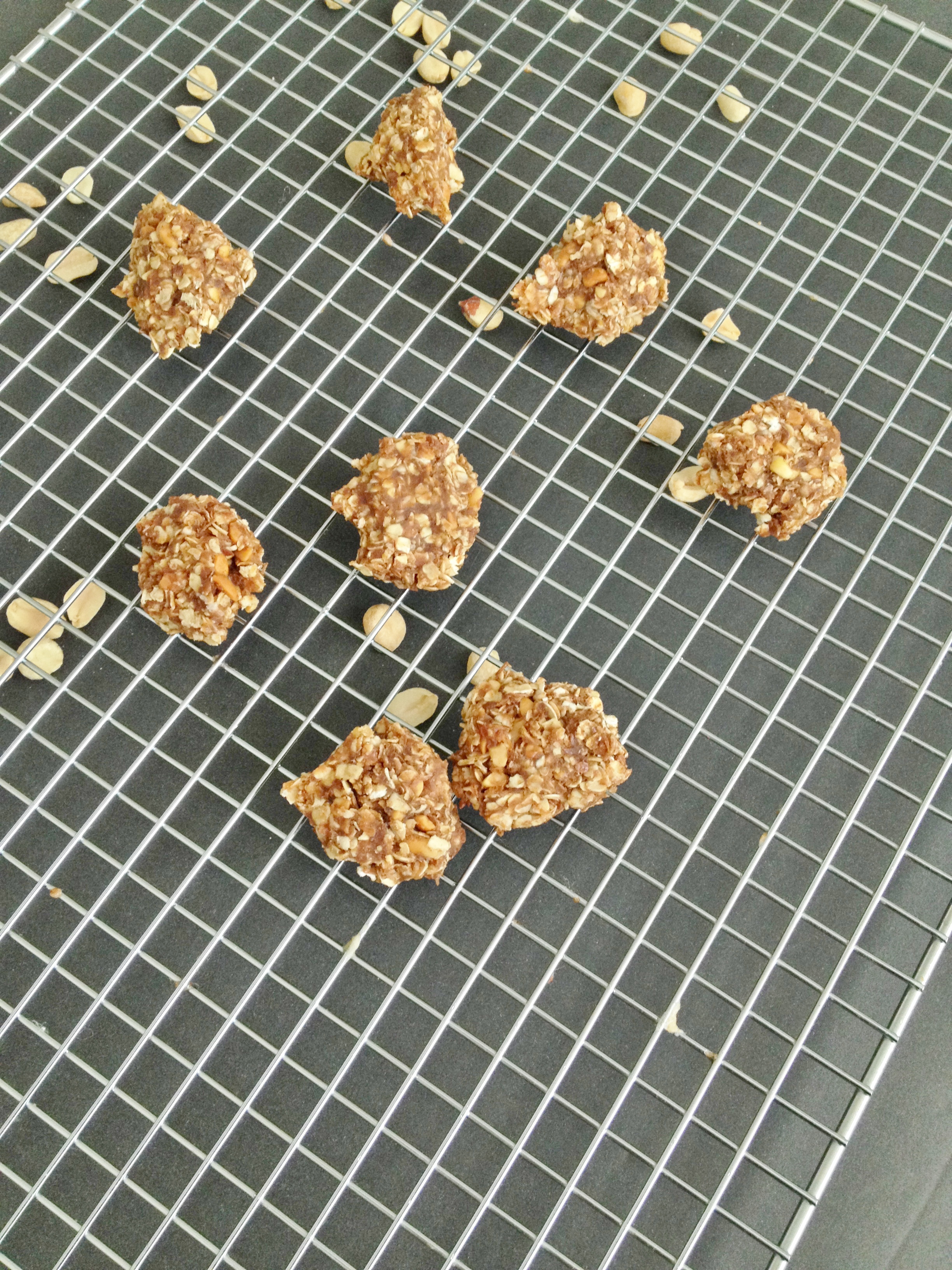 Start by lining a baking sheet with tin foil, and of course make room in your fridge for a baking sheet to sit. In a medium size bowl dump oats, flax, and cinnamon and mix. In a microwave safe bowl or cup dump crunchy peanut butter, simple syrup, vanilla extract, and soy milk. I set the microwave for one minute and then forgot to stop it at 30 seconds to mix it, so it spit and bubbled over a little in my microwave – my warning to you. Stop in intervals to mix! After 60 seconds take out and mix really well then dump into oats. Use a spoon to mix really well then use a small spoon to scoop out mixture. Press the dough into a ball with your hand then roll, gently and set on baking sheet. Once all cookies are laid out put baking sheet into the fridge and let sit until all are hardened, about 1 1/2 to 2 hours. Enjoy!