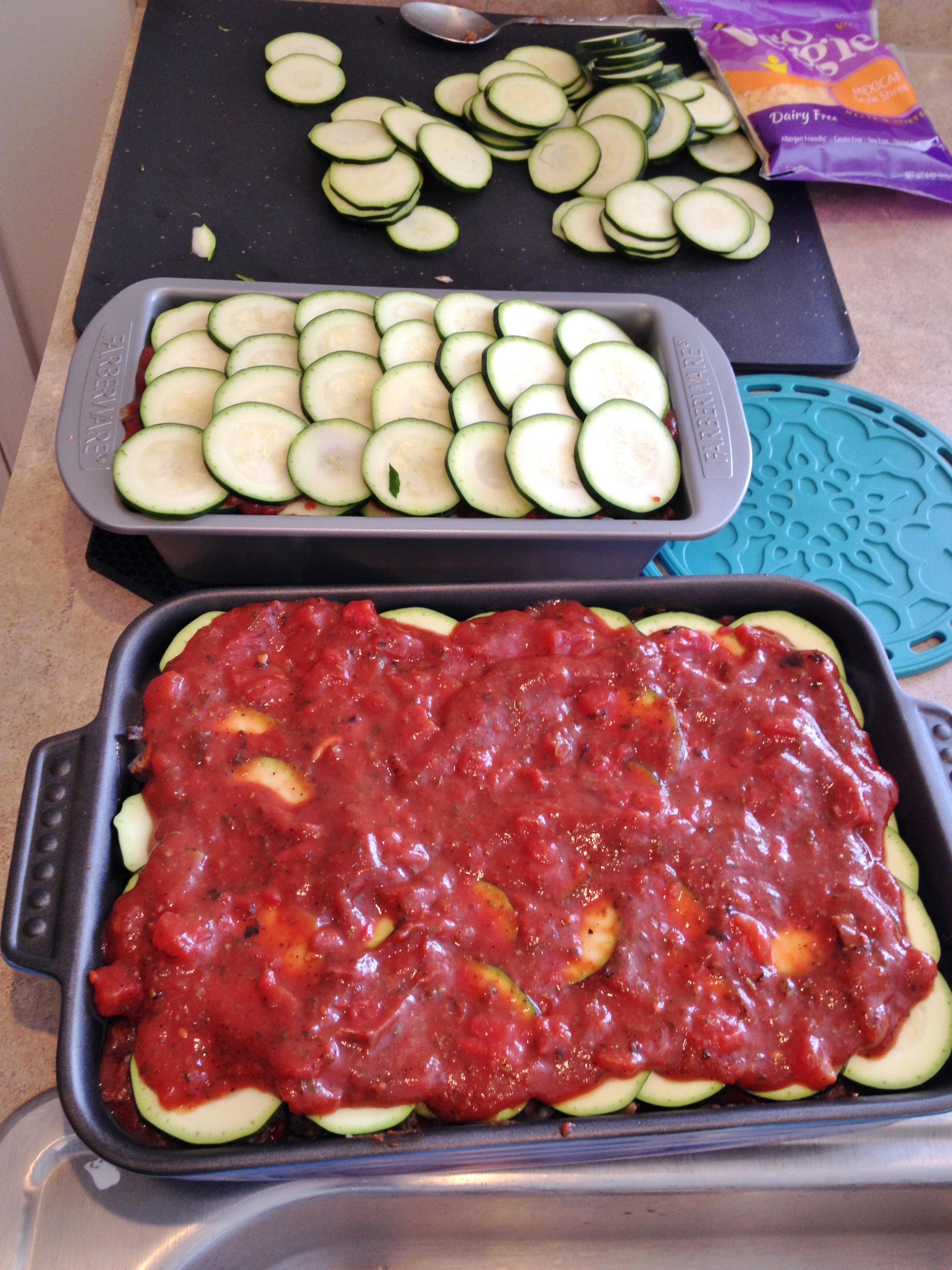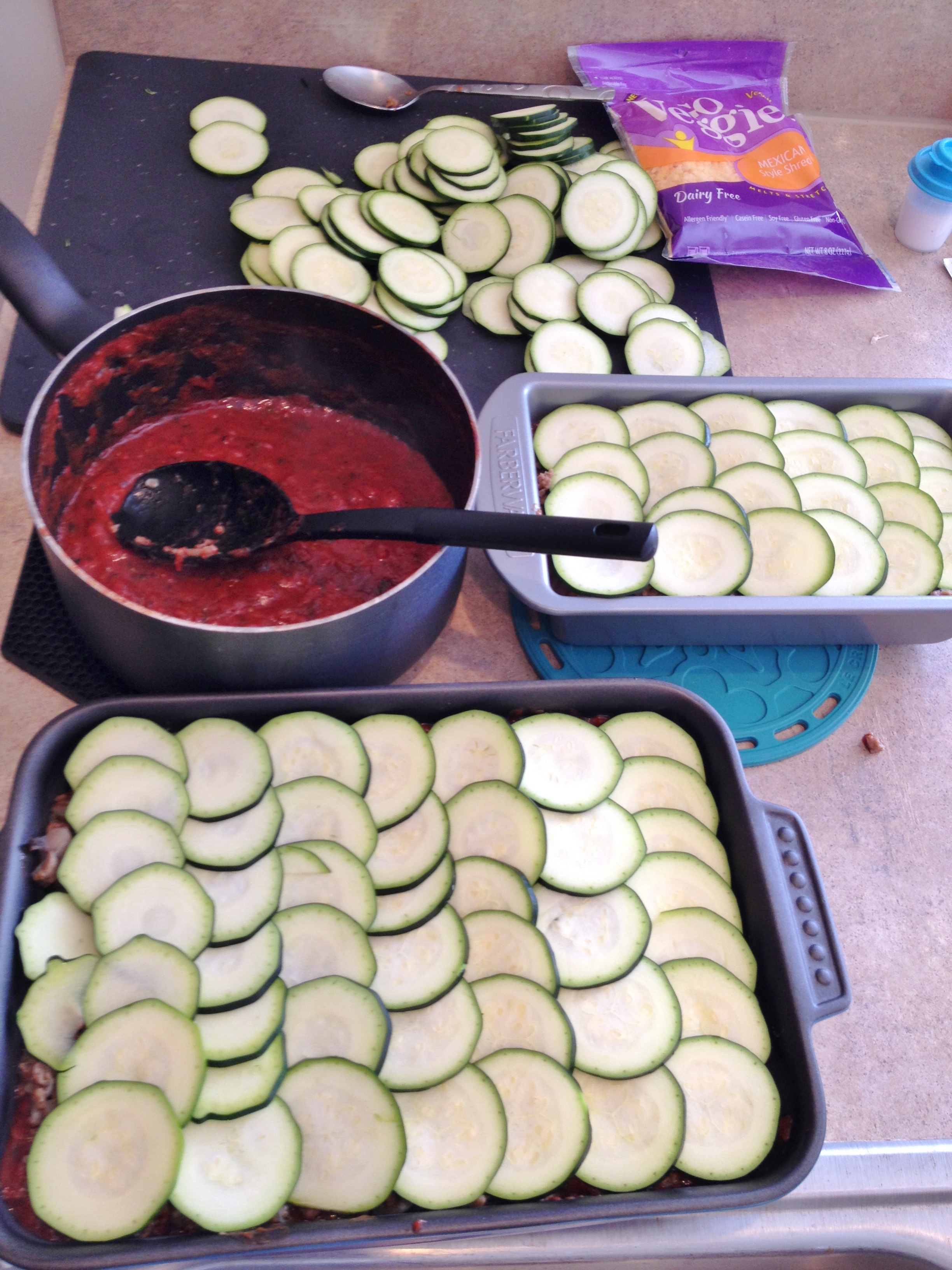 Start by chopping all veggies; pour about quarter cup veg broth into a saute pan then add veggies and garlic. Sprinkle a little salt then saute on medium heat until liquid is gone. Once liquid is gone add meatless crumbles and mix and turn to medium-low until crumbles are defrosted and no more liquid is in pan then turn off. Once veggies are on the burner add tomatoes, spices and balsamic to a pot and turn to medium heat. Let cook and stir; lower heat if it starts to spit at you. While that is working slice your zucchini into a big pile. Place pans next to zucchini then set up your operation. I had to use two pans because I had so much zucchini. Start layering with a little sauce on the bottom of the pans, next the veggies, then the zucchini. Continue until everything is used then top with a little cheese. My last two layers on top were zucchini and sauce twice – I had so much zucchini left but no veggies that I layered zuc, sauce, zuc then cheese. I didn’t use cheese throughout just a little on top – fewer calories this way. Place pans on baking sheets to catch any overflow then bake at 350 degrees for 45 minutes. Let sit a little then enjoy!