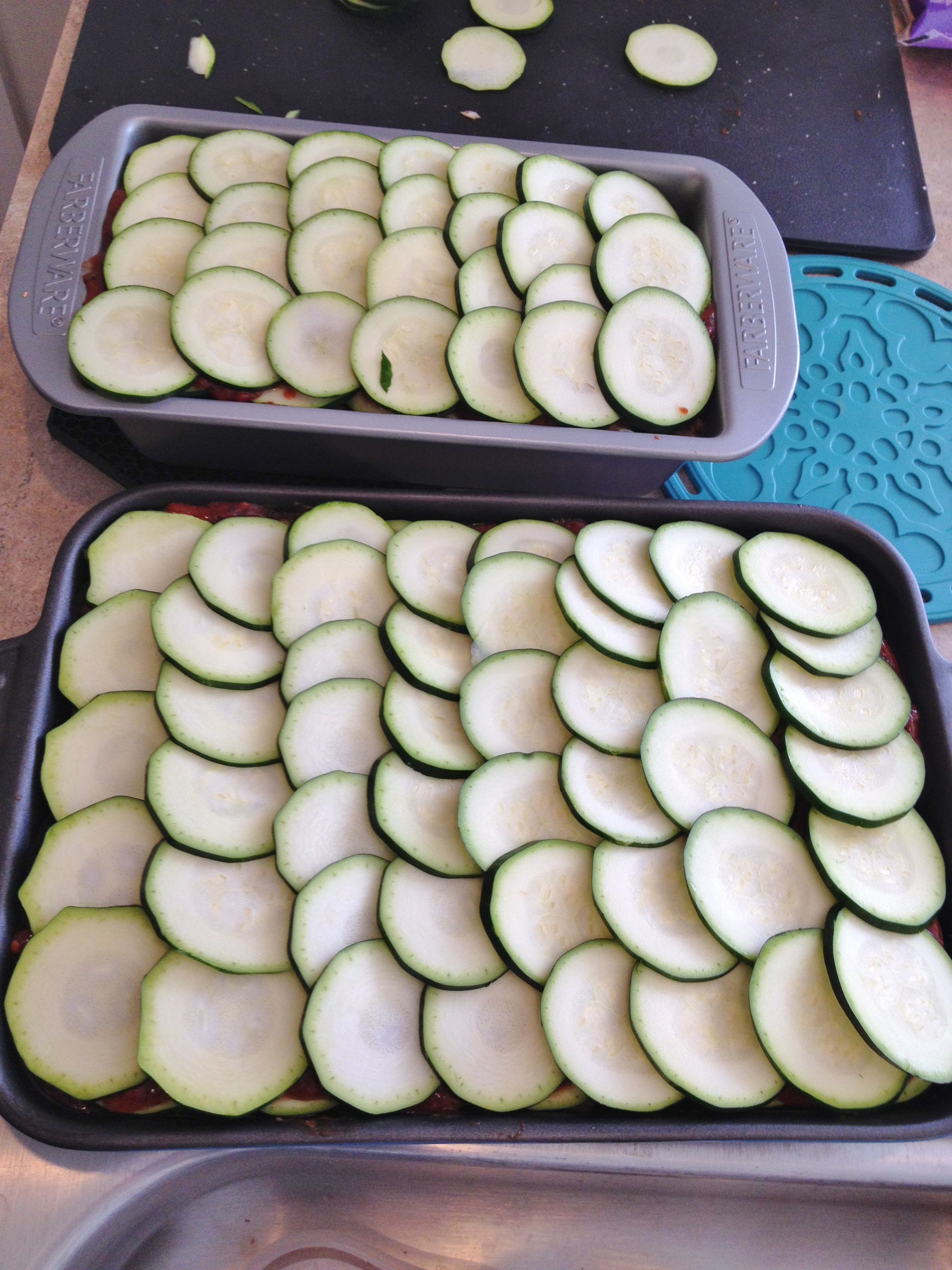 6. Line up baking pans then set veggies and sauce on trivets or towels next to pans and zucchini.