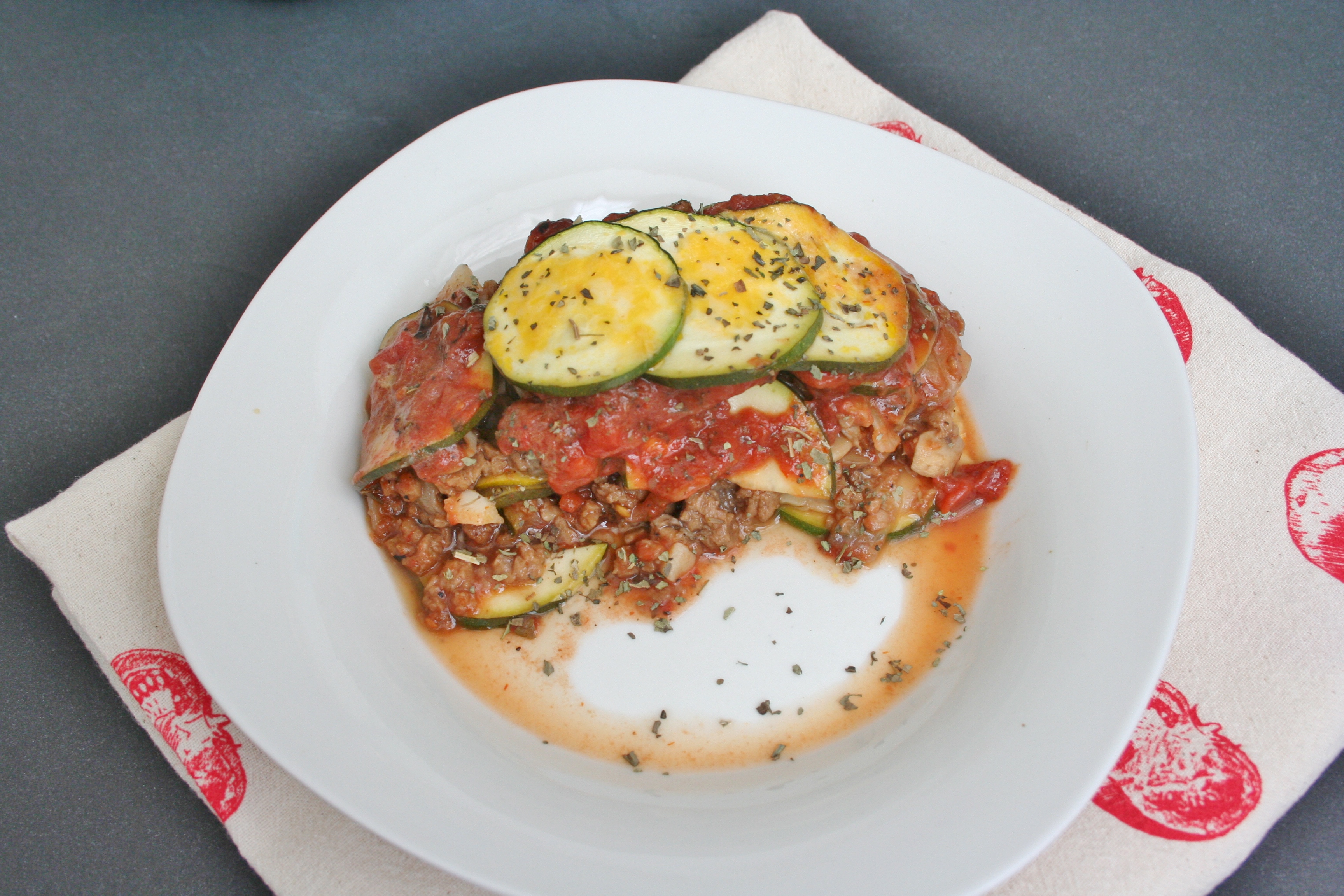 Well I knew it was going to be zucchini because the store had some amazing looking squash – nice and dark green and huge. But I didn’t want to make the long cut of noodles like an actual floured up noodle – they don’t cut well and then they squish down, and then some portions don’t the noodle. Anyway – personal problem. So I (carefully) used my mandolin and sliced the zucchini into small, thin rounds and layered them up. It looks so pretty right? I made my own spicy and a little smoky marinara sauce and added balsamic – the balsamic makes the sauce taste like it has been on the stove for hours and adds a deeper flavor. I had tried to make the sauce thicker, but didn’t workout so well. I sauteed up the mushrooms and onions then added the GF meatless crumbles. Layered the sauce and zuc slices and topped with a little vegan/GF cheese.