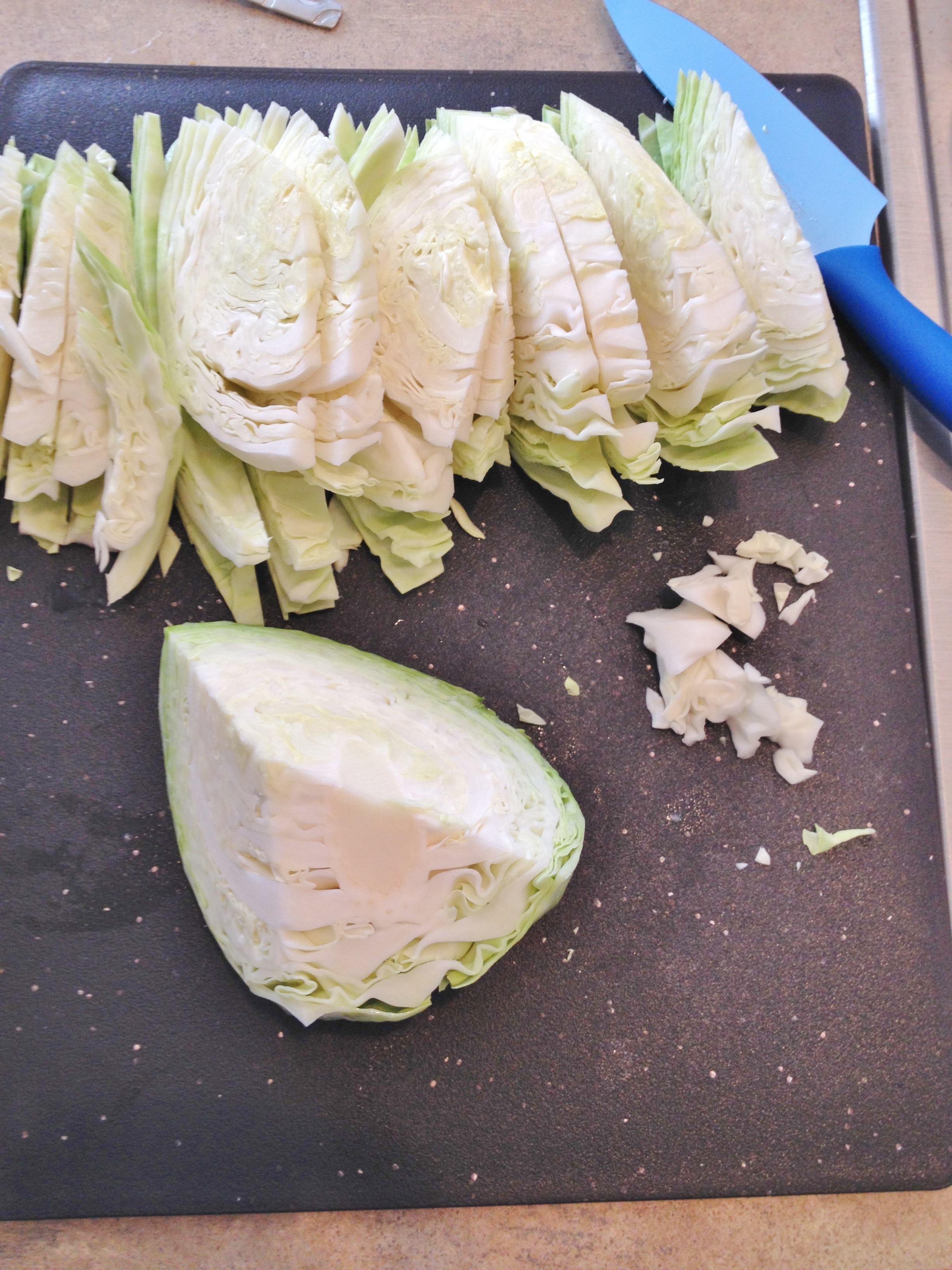 3. Take outer layers off cabbage and slice then spread over baking sheet.