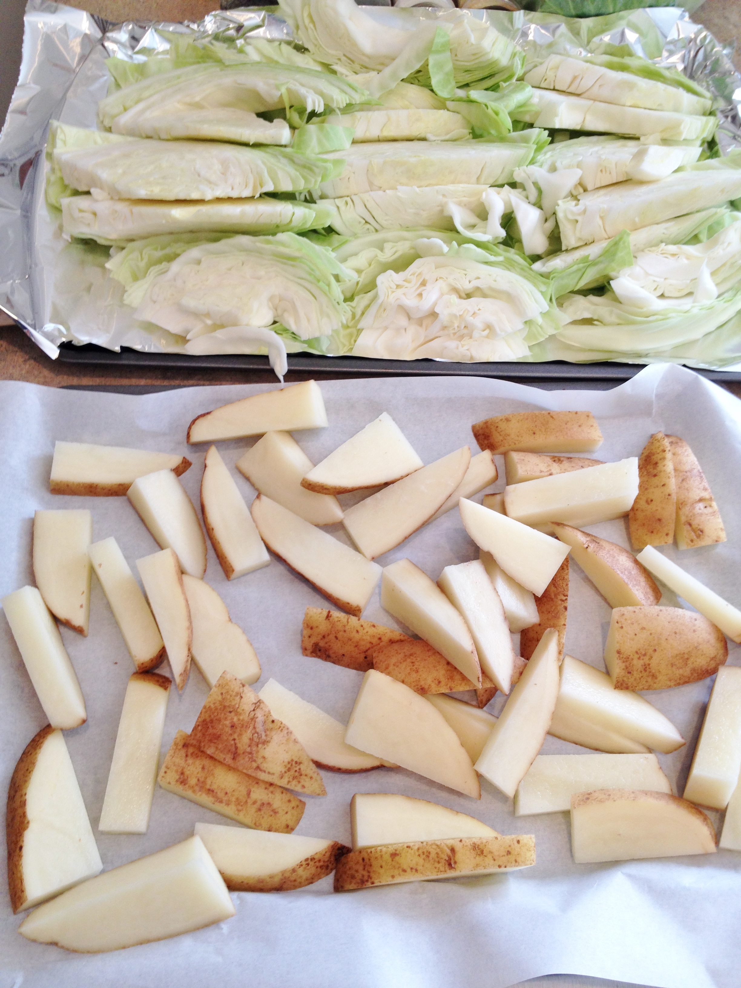 5. Sprinkle olive oil and herb mix evenly over all veggies – more over cabbage then potatoes.
